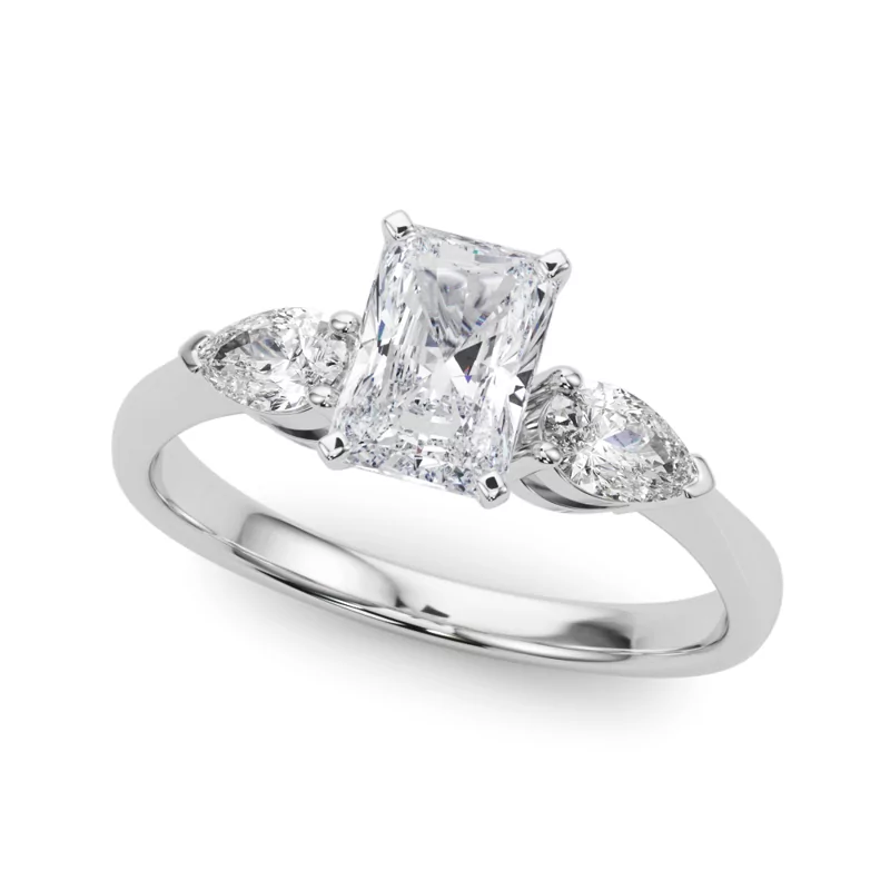 Oksana Three Stone Engagement Ring With Pear Shape Side Diamonds With 3 Carat radiant Lab Diamond