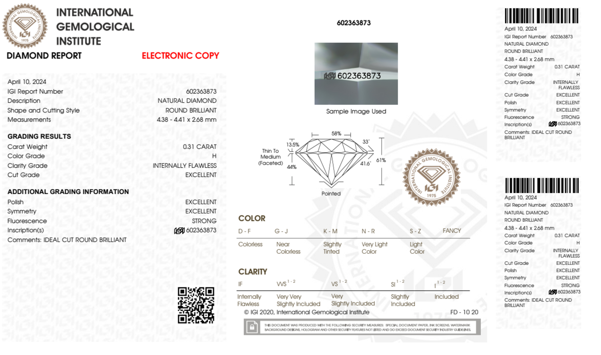 Your 0.31 carat Round natural diamond is graded IF clarity, which stands for Internally Flawless. Read more about IF clarity diamonds here, or learn more about diamond clarity in general here.
