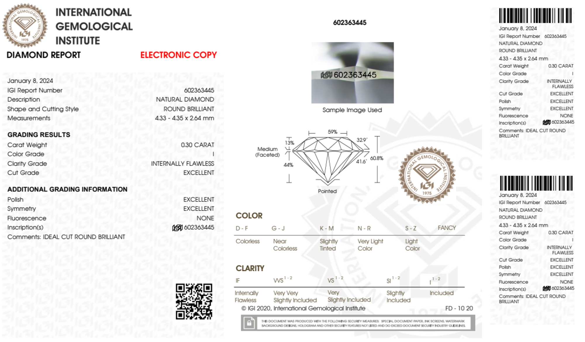 Your 0.30 carat Round natural diamond is graded IF clarity, which stands for Internally Flawless. Read more about IF clarity diamonds here, or learn more about diamond clarity in general here.