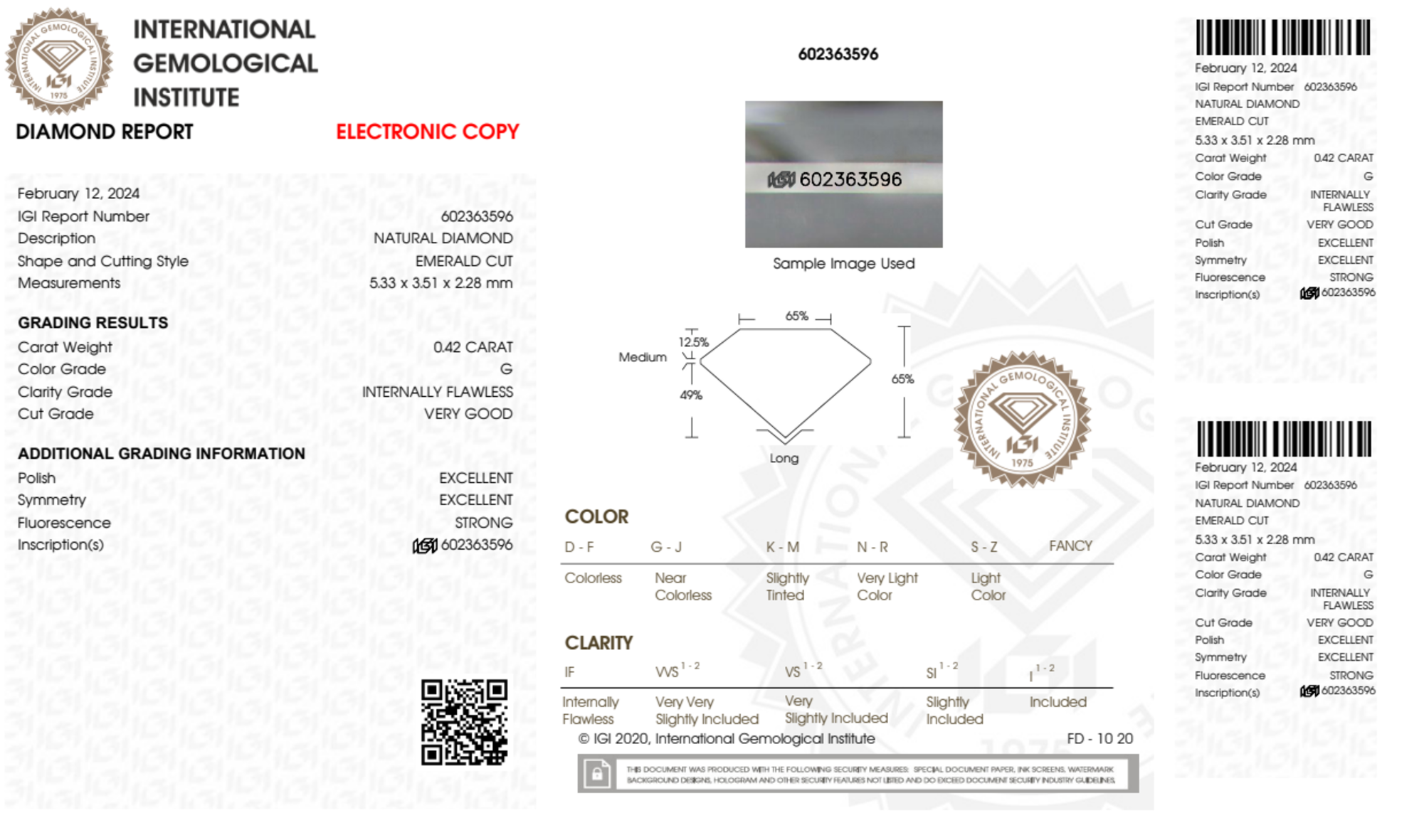 Your 0.42 carat Emerald natural diamond is graded IF clarity, which stands for Internally Flawless. Read more about IF clarity diamonds here, or learn more about diamond clarity in general here.