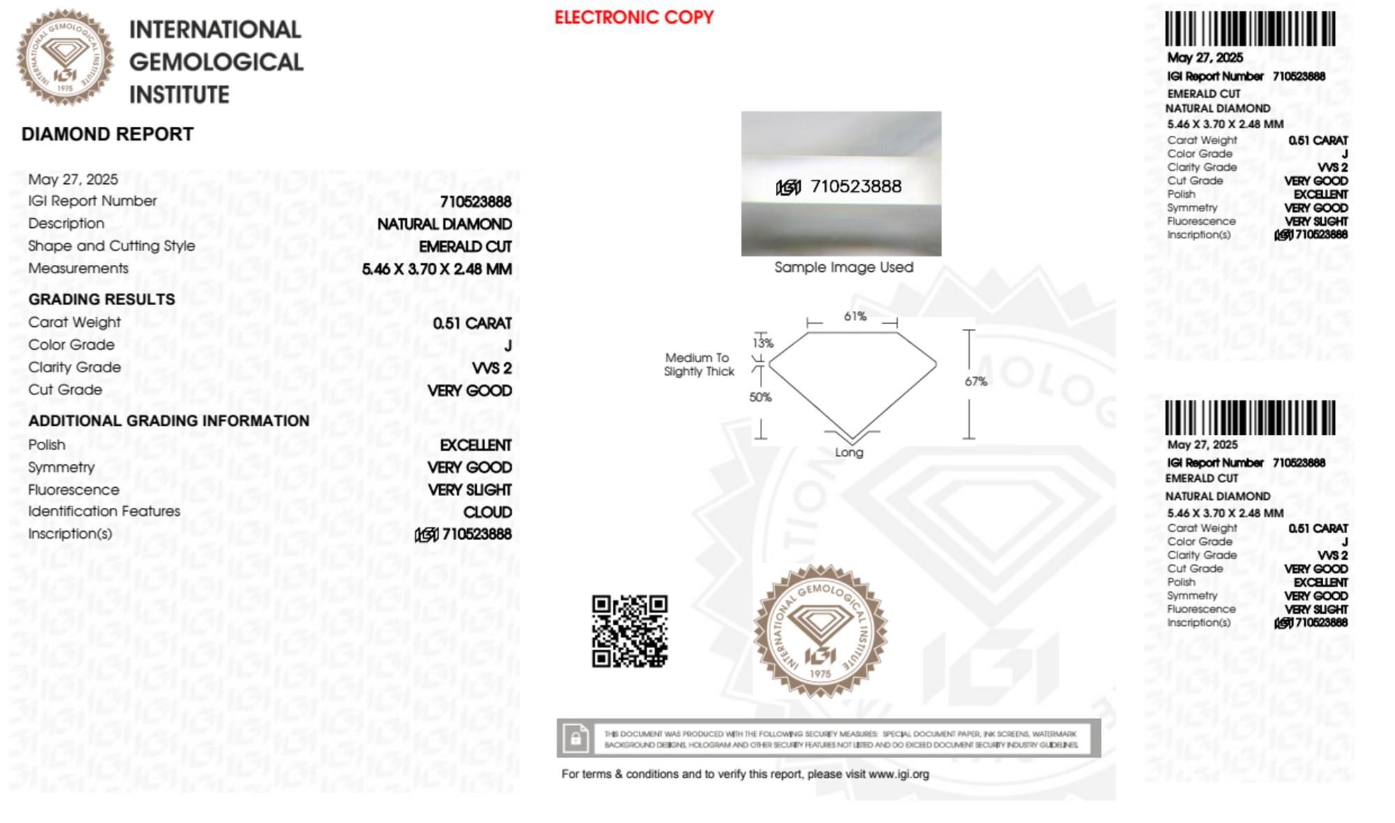 Your 0.51 carat Emerald natural diamond is graded J color (Near Colorless), and you can read more about J color diamonds here.