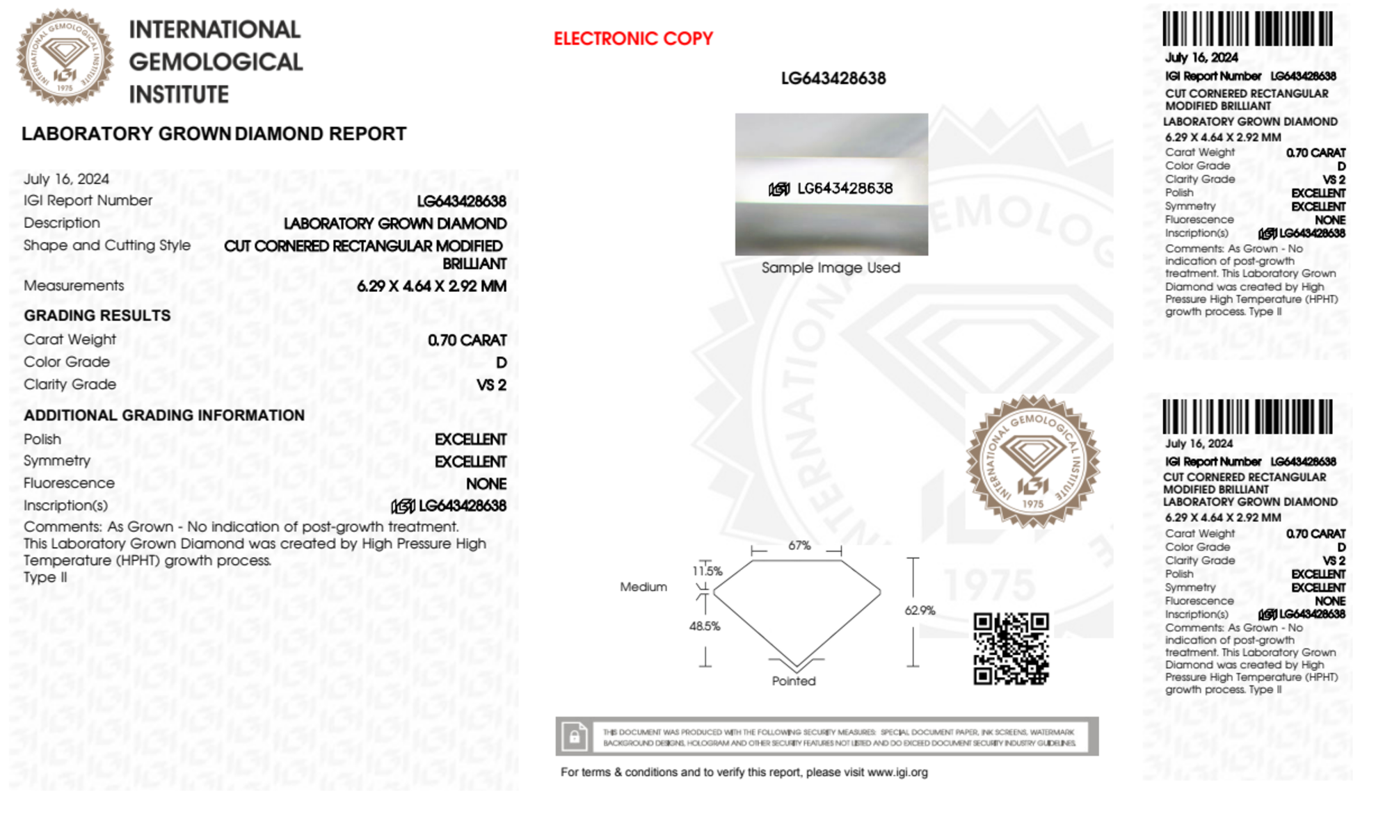Your 0.70 carat Radiant lab diamond is graded D color (Colorless), and you can read more about D color diamonds here.