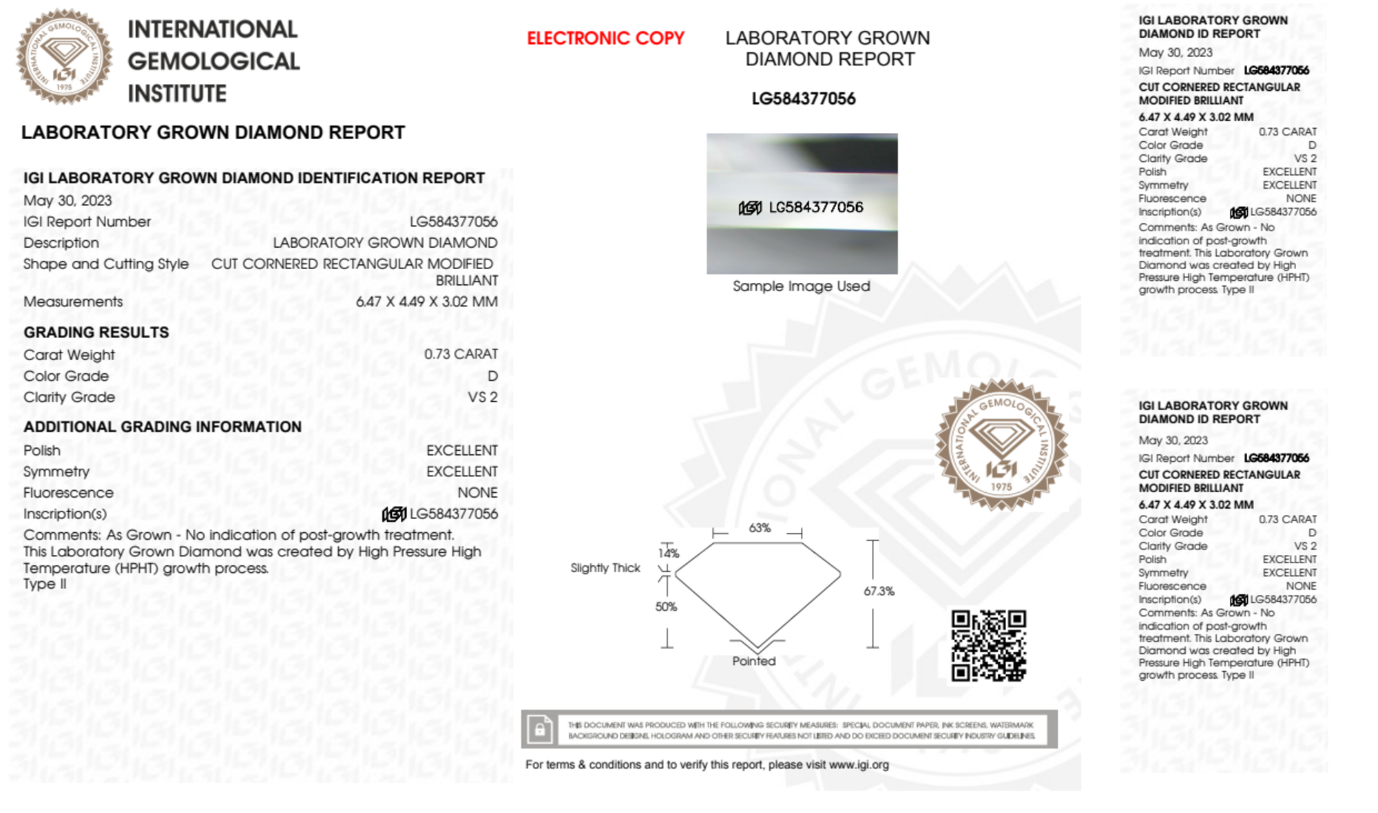 Your 0.73 carat Radiant lab diamond is graded D color (Colorless), and you can read more about D color diamonds here.