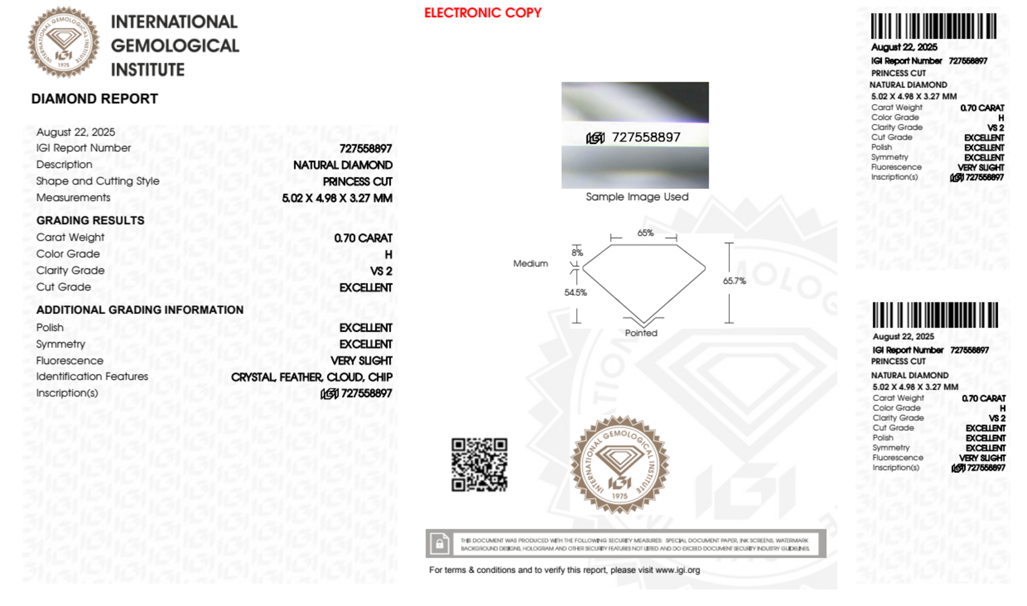 Your 0.70 carat Princess natural diamond is graded VS2 clarity, which stands for Very Slightly Included 2. Read more about VS2 clarity diamonds here, or learn more about diamond clarity in general here.