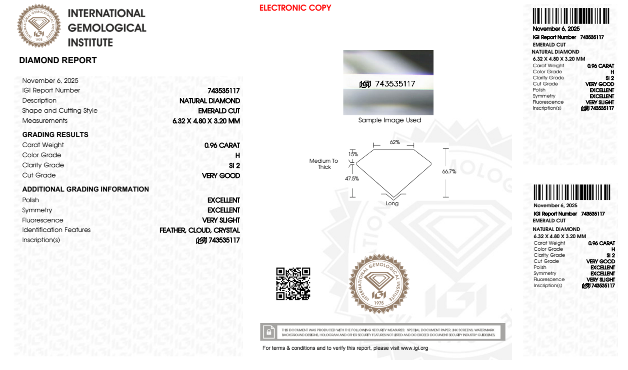 Your 0.96 carat Emerald natural diamond is graded SI2 clarity, which stands for Slightly Included 2. Read more about SI2 clarity diamonds here, or learn more about diamond clarity in general here.