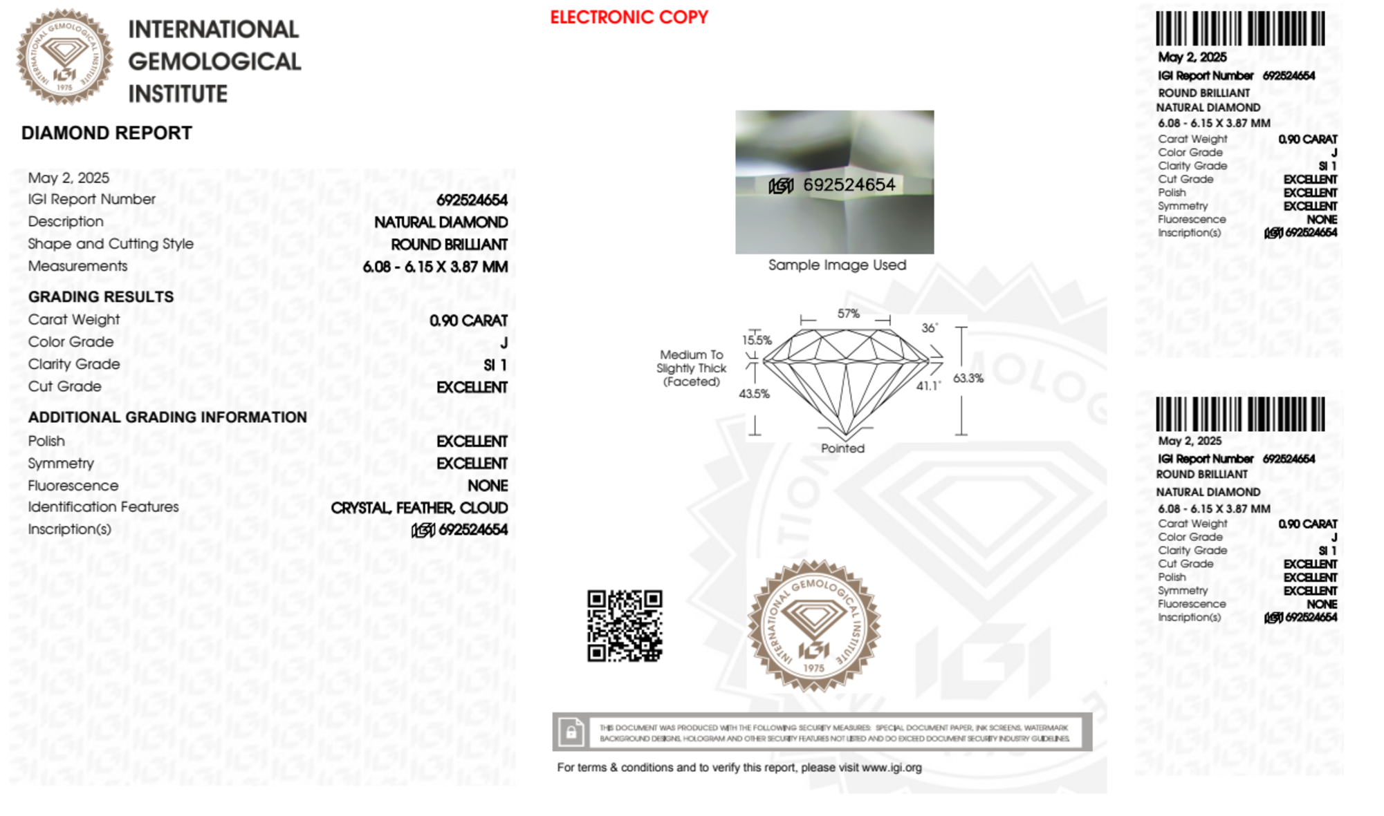 Your 0.90 carat Round natural diamond is graded SI1 clarity, which stands for Slightly Included 1. Read more about SI1 clarity diamonds here, or learn more about diamond clarity in general here.