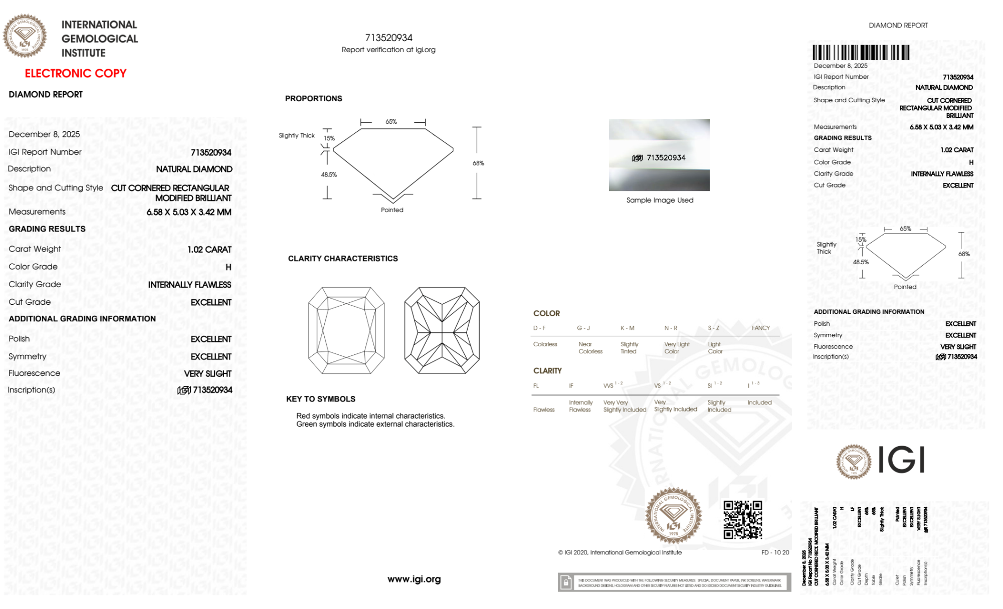 Your 1.02 carat Radiant natural diamond is graded IF clarity, which stands for Internally Flawless. Read more about IF clarity diamonds here, or learn more about diamond clarity in general here.