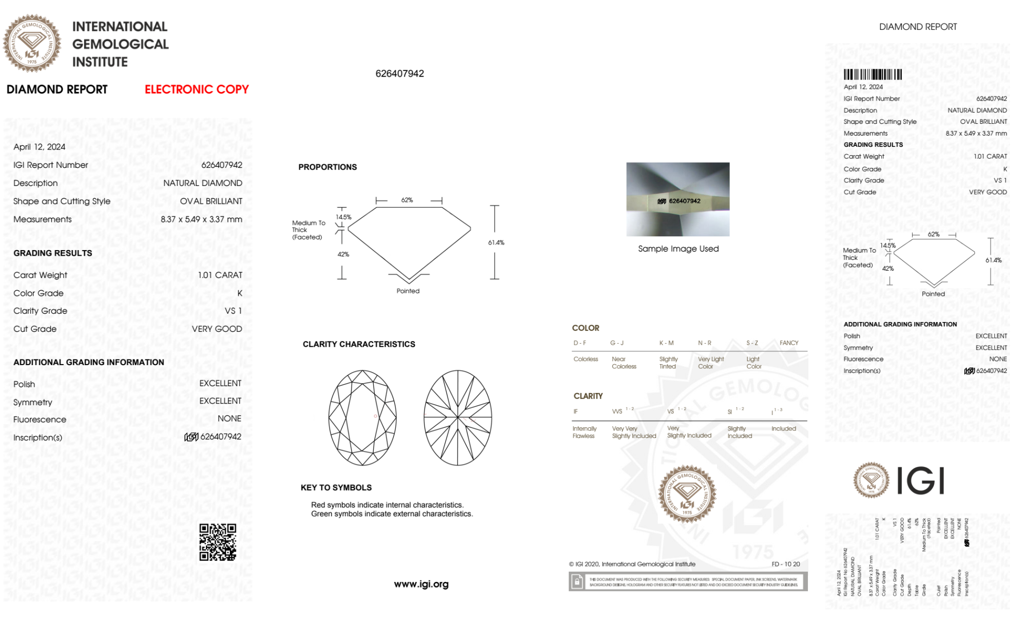 Your 1.01 carat Oval natural diamond is graded VS1 clarity, which stands for Very Slightly Included 1. Read more about VS1 clarity diamonds here, or learn more about diamond clarity in general here.