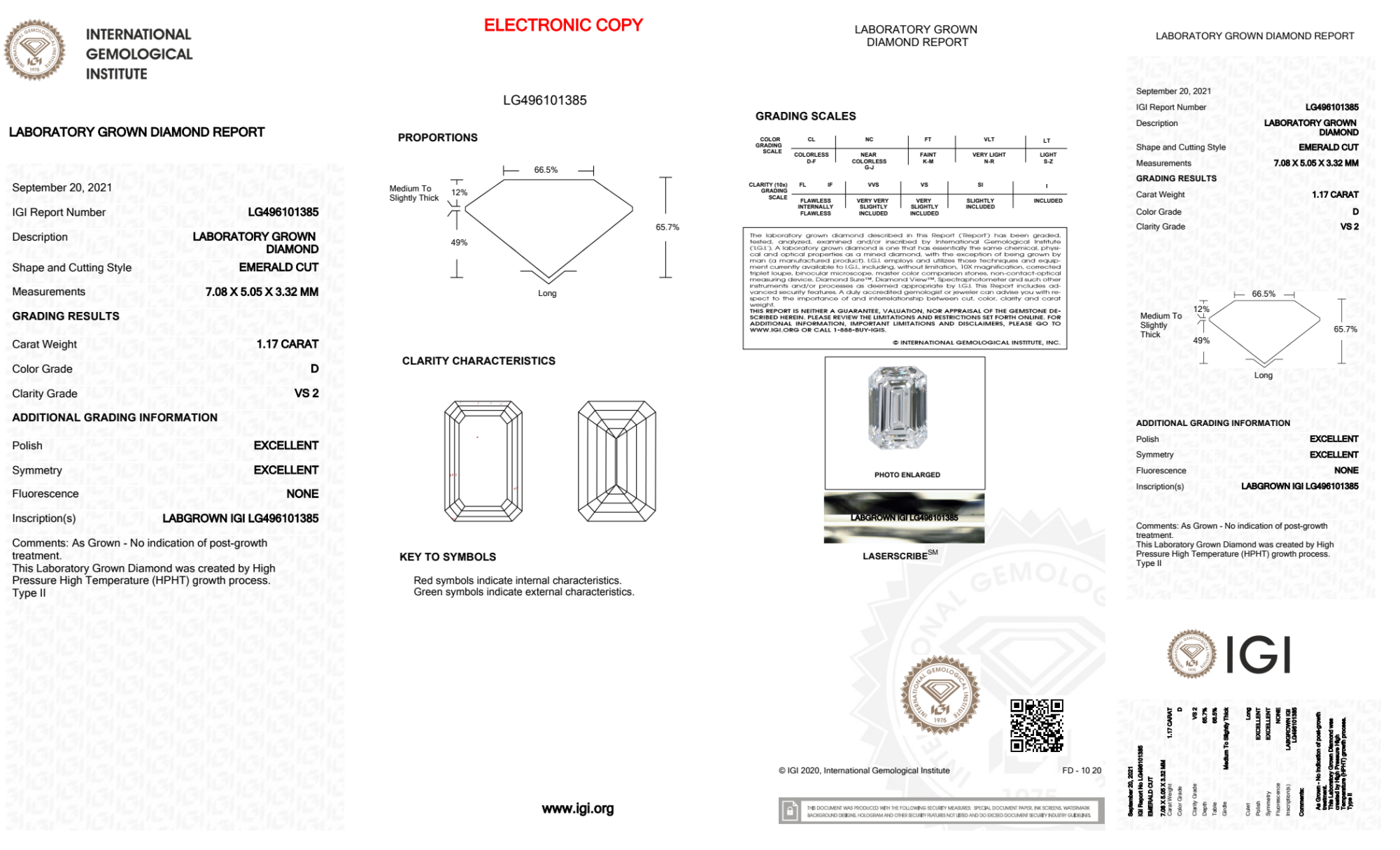 Your 1.17 carat Emerald lab diamond is graded VS2 clarity, which stands for Very Slightly Included 2. Read more about VS2 clarity diamonds here, or learn more about diamond clarity in general here.