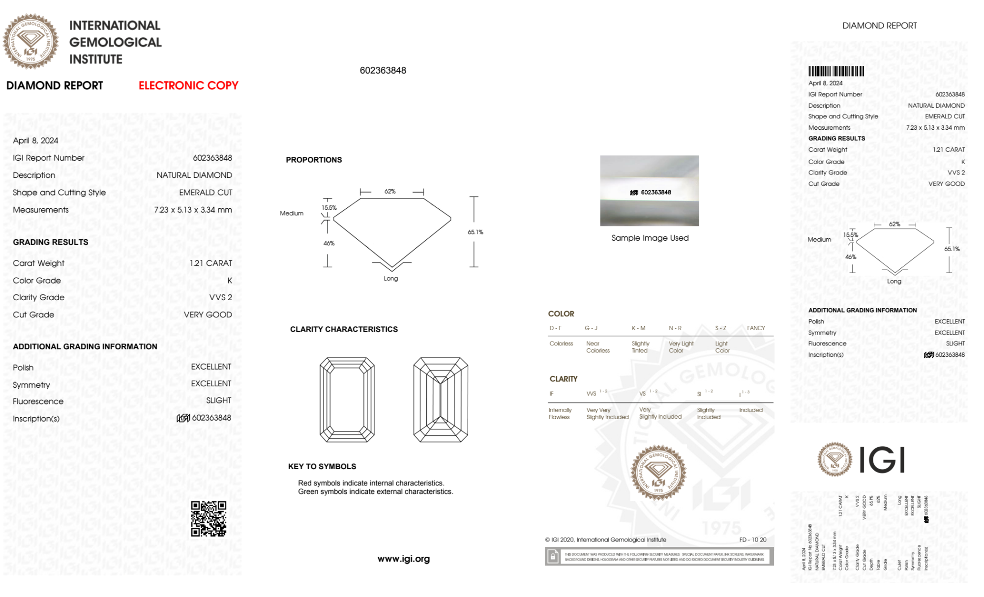 Your 1.21 carat Emerald natural diamond is graded VVS2 clarity, which stands for Very Very Slightly Included 2. Read more about VVS2 clarity diamonds here, or learn more about diamond clarity in general here.