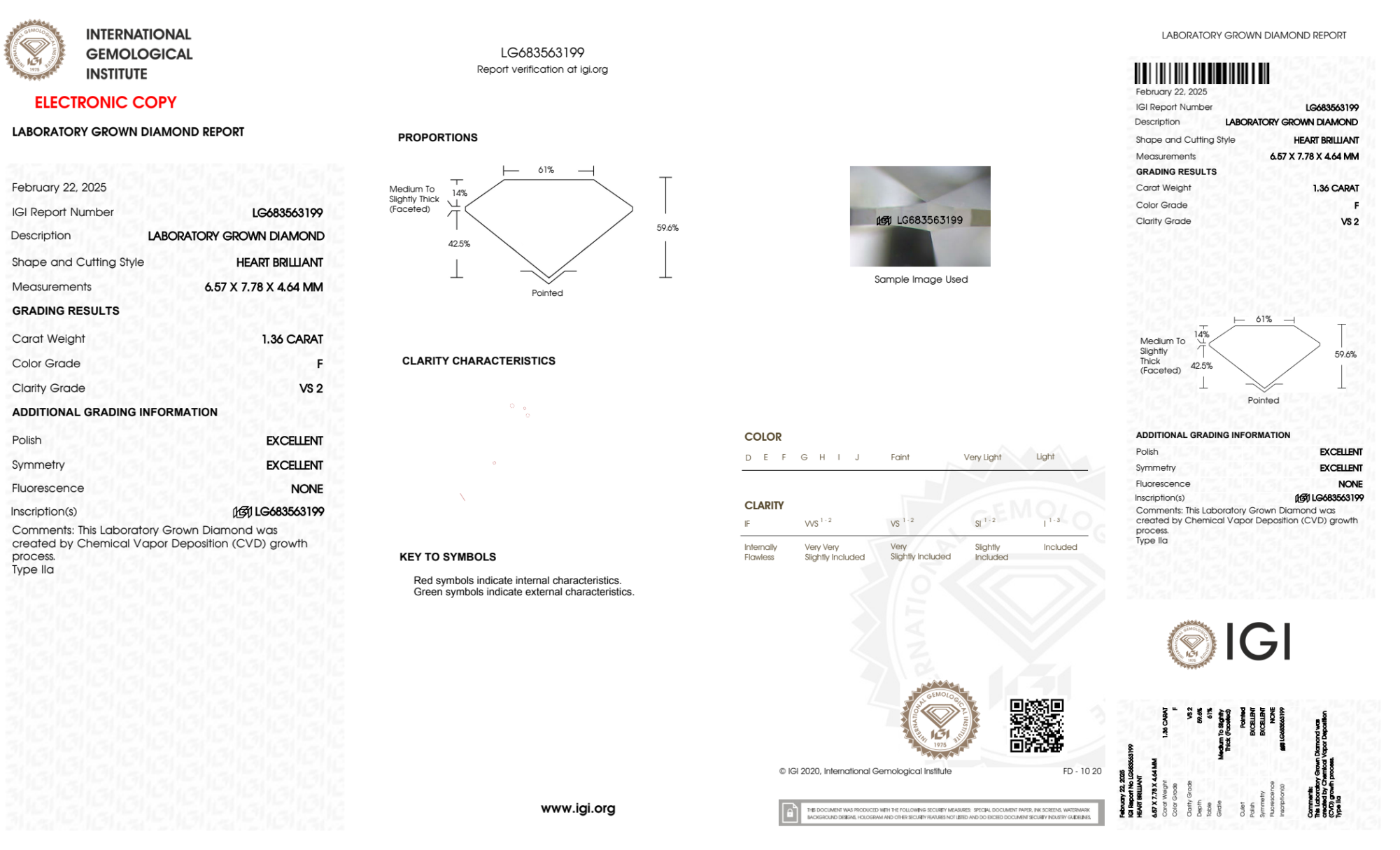 Your 1.36 carat Heart lab diamond is graded F color (Colorless), and you can read more about F color diamonds here.