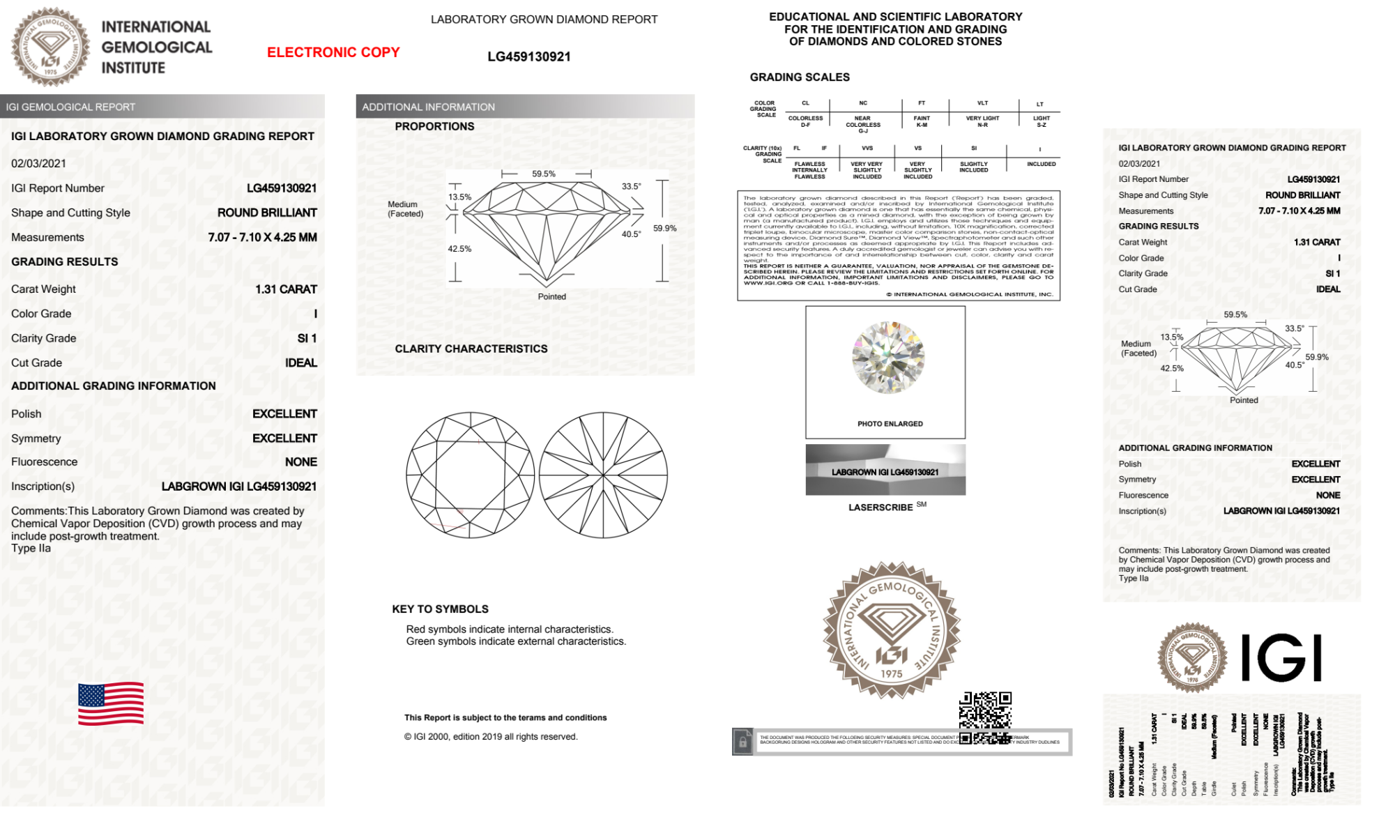Your 1.31 carat Round lab diamond is graded SI1 clarity, which stands for Slightly Included 1. Read more about SI1 clarity diamonds here, or learn more about diamond clarity in general here.
