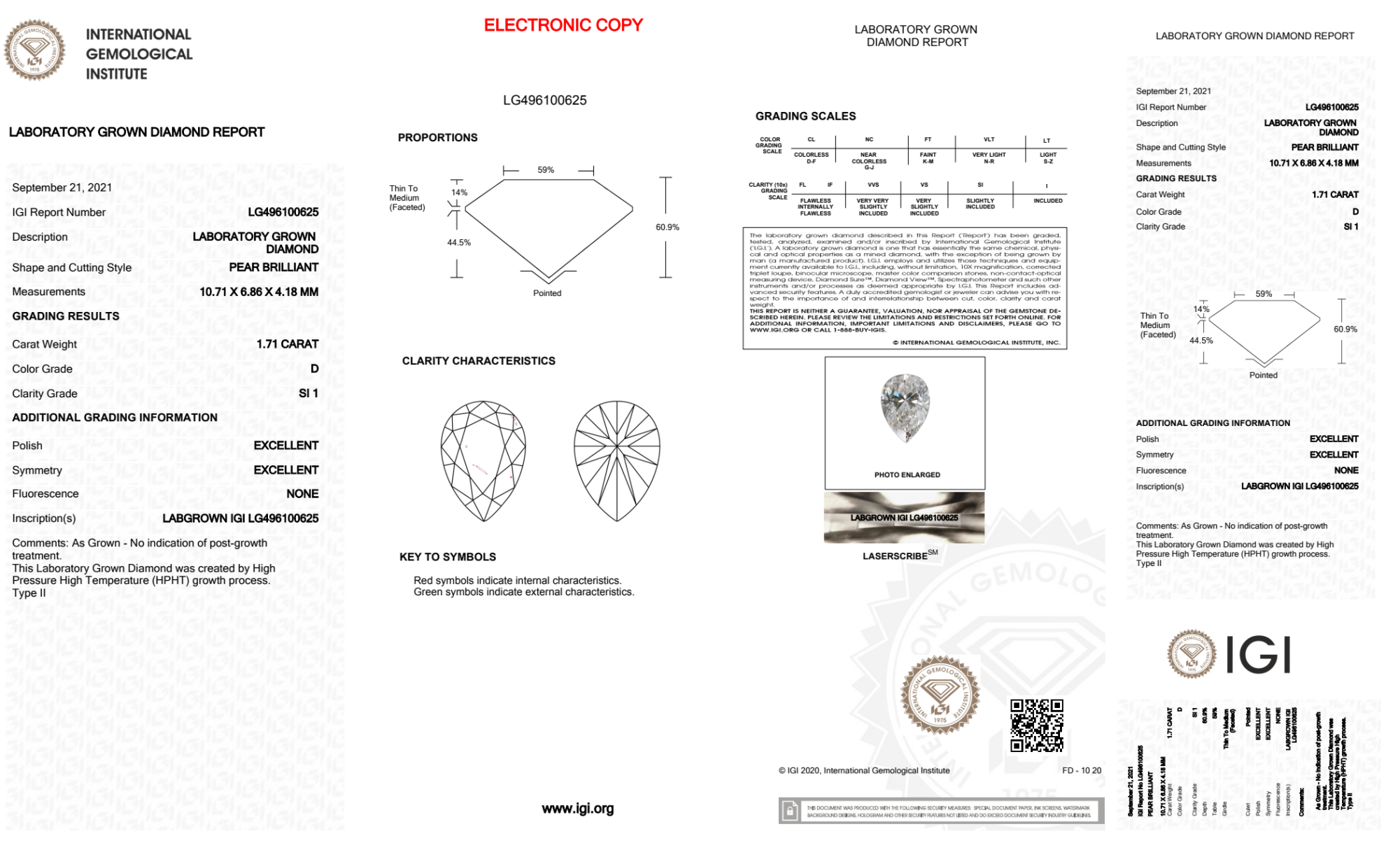Your 1.71 carat Pear lab diamond is graded D color (Colorless), and you can read more about D color diamonds here.