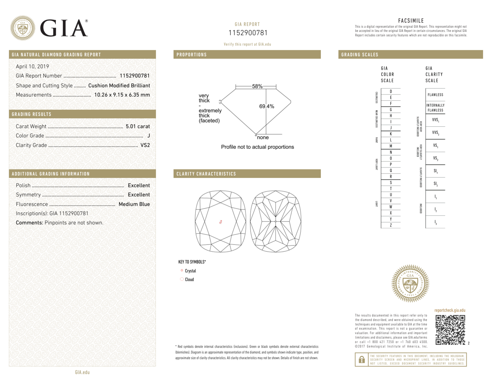 Your 5.01 carat Cushion natural diamond is graded VS2 clarity, which stands for Very Slightly Included 2. Read more about VS2 clarity diamonds here, or learn more about diamond clarity in general here.