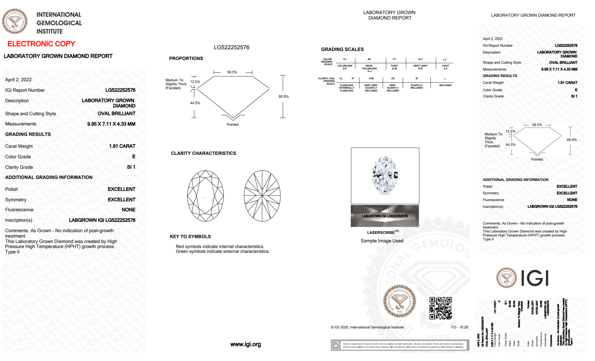 Your 1.91 carat Oval lab diamond is graded E color (Colorless), and you can read more about E color diamonds here.