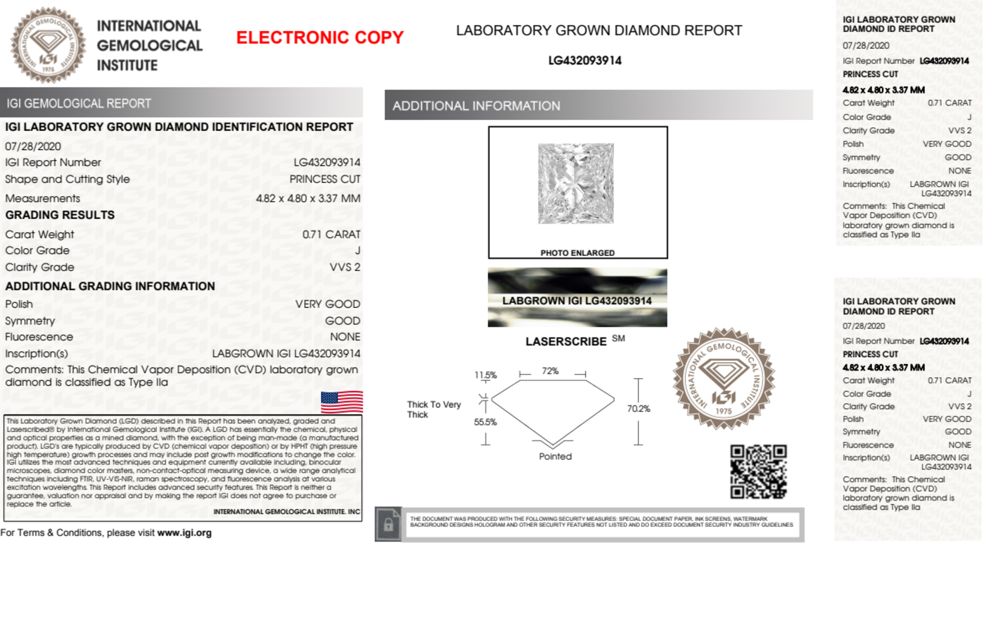 Your 0.71 carat Princess lab diamond is graded J color (Near Colorless), and you can read more about J color diamonds here.