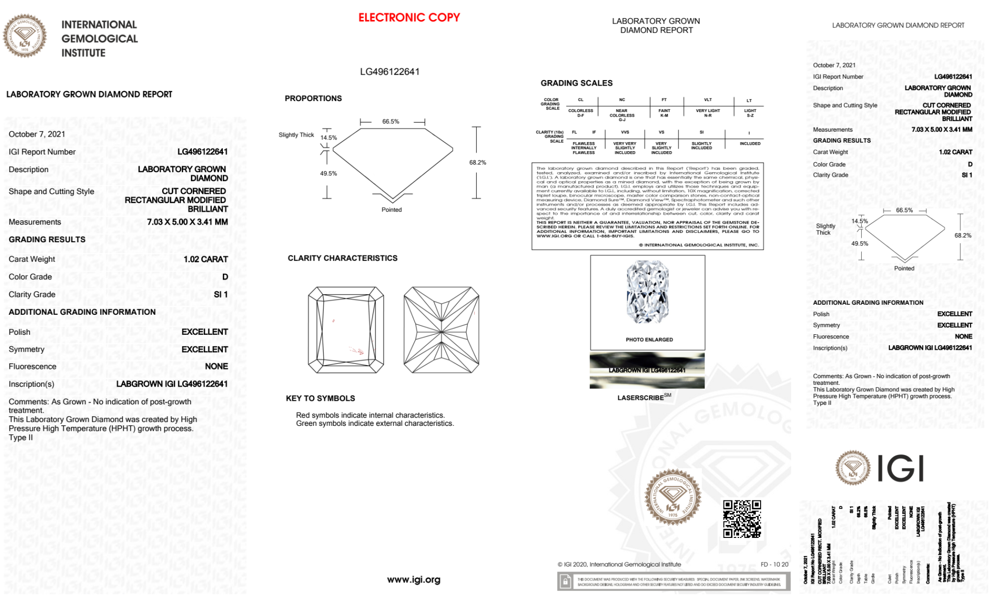Your 1.02 carat Radiant lab diamond is graded D color (Colorless), and you can read more about D color diamonds here.