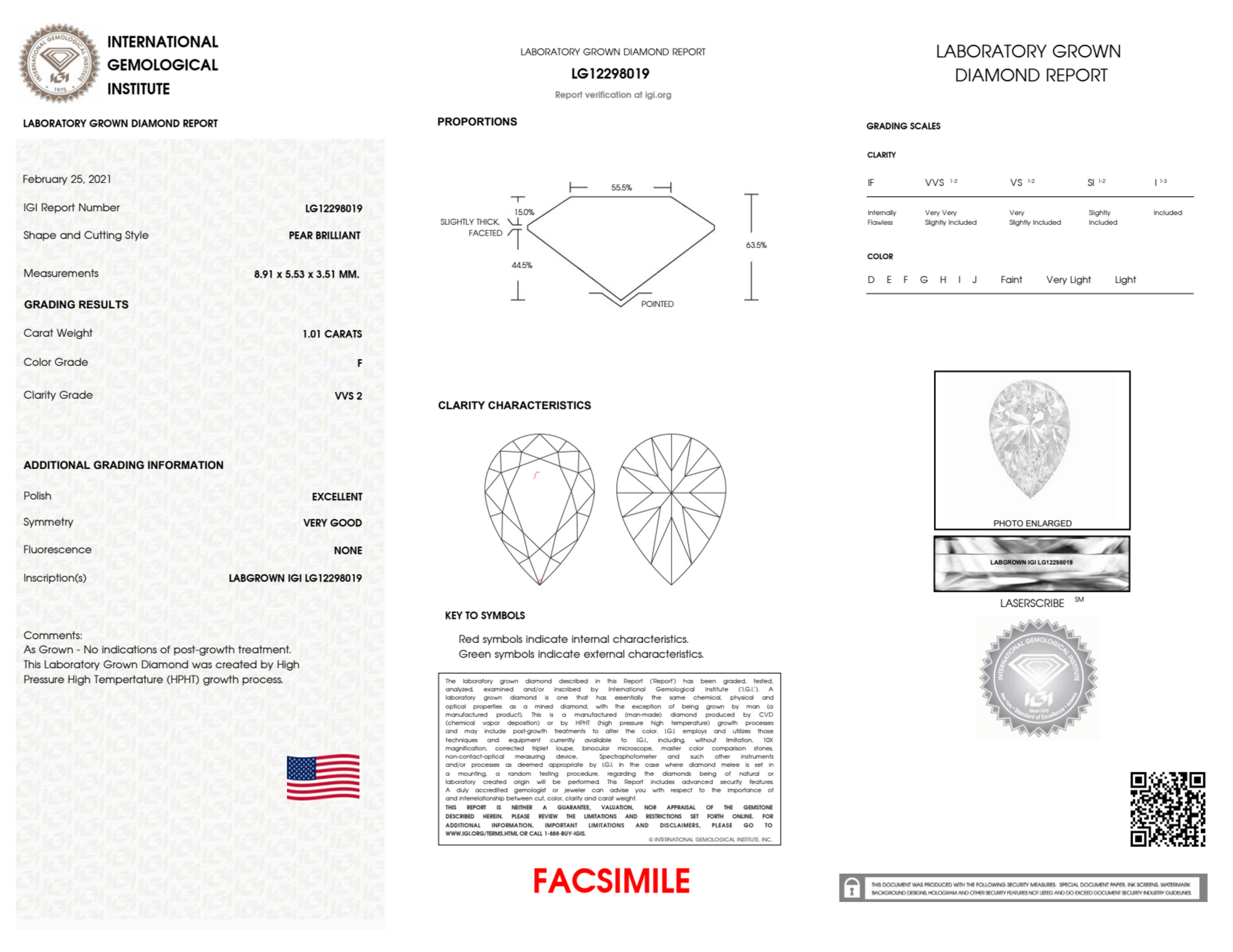 Your 1.01 carat Pear lab diamond is graded F color (Colorless), and you can read more about F color diamonds here.