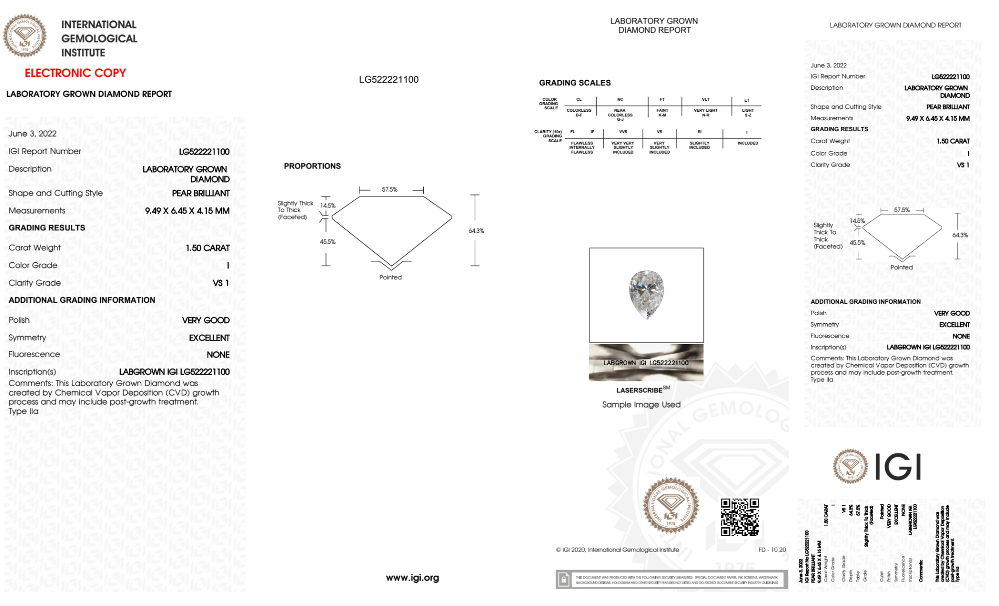 Your 1.50 carat Pear lab diamond is graded I color (Near Colorless), and you can read more about I color diamonds here.