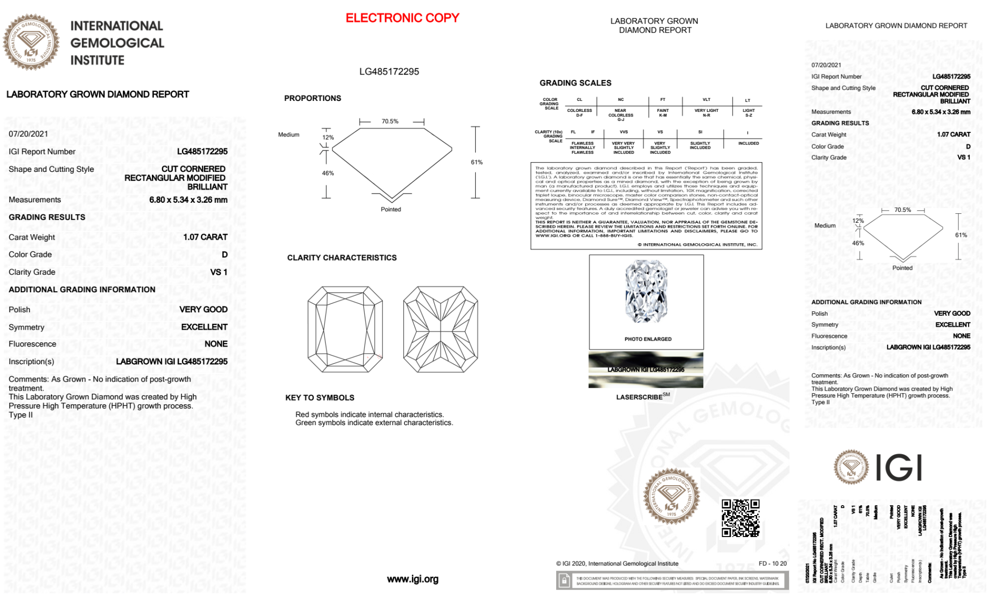 Your 1.07 carat Radiant lab diamond is graded D color (Colorless), and you can read more about D color diamonds here.