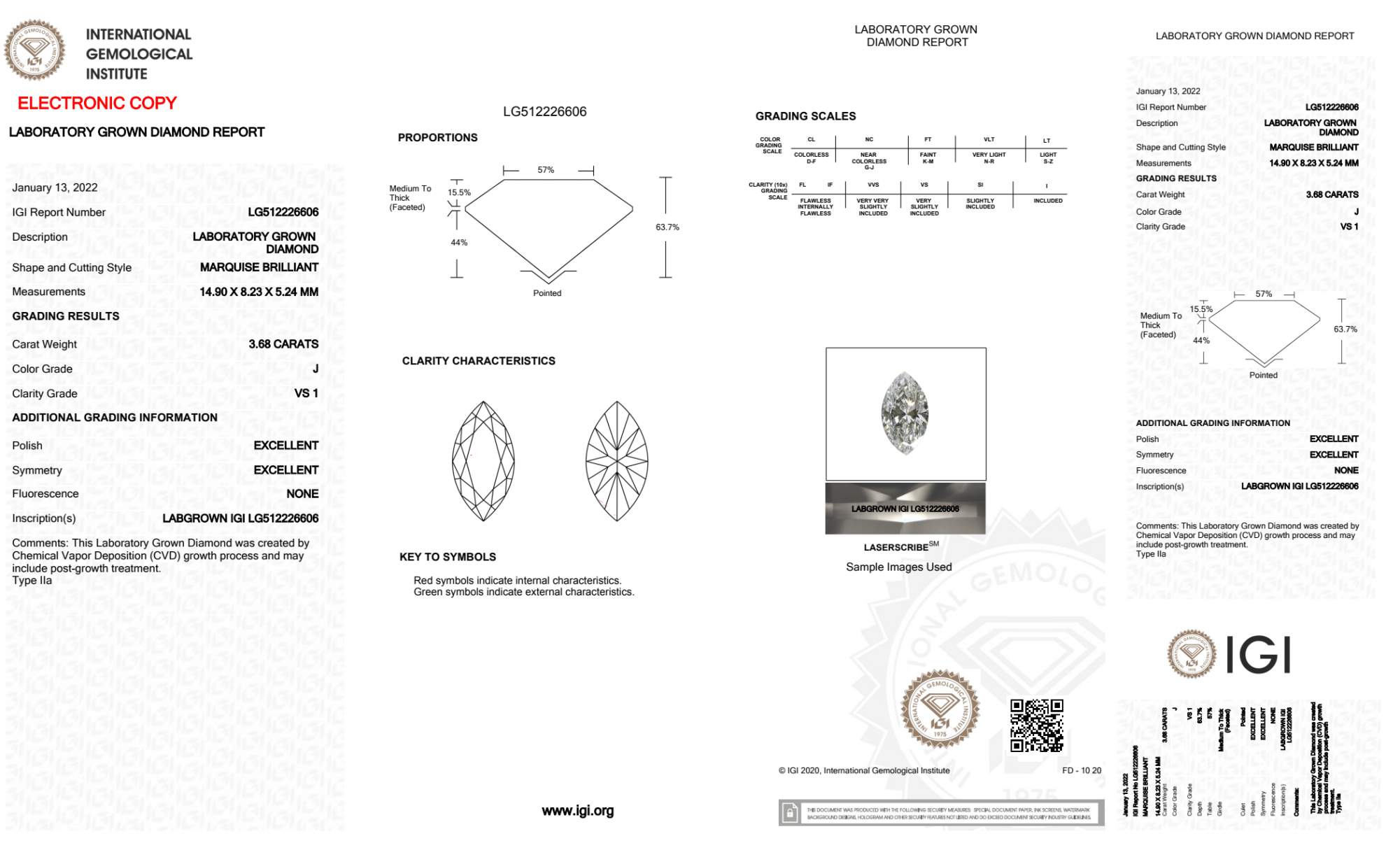 Your 3.68 carat Marquise lab diamond is graded J color (Near Colorless), and you can read more about J color diamonds here.