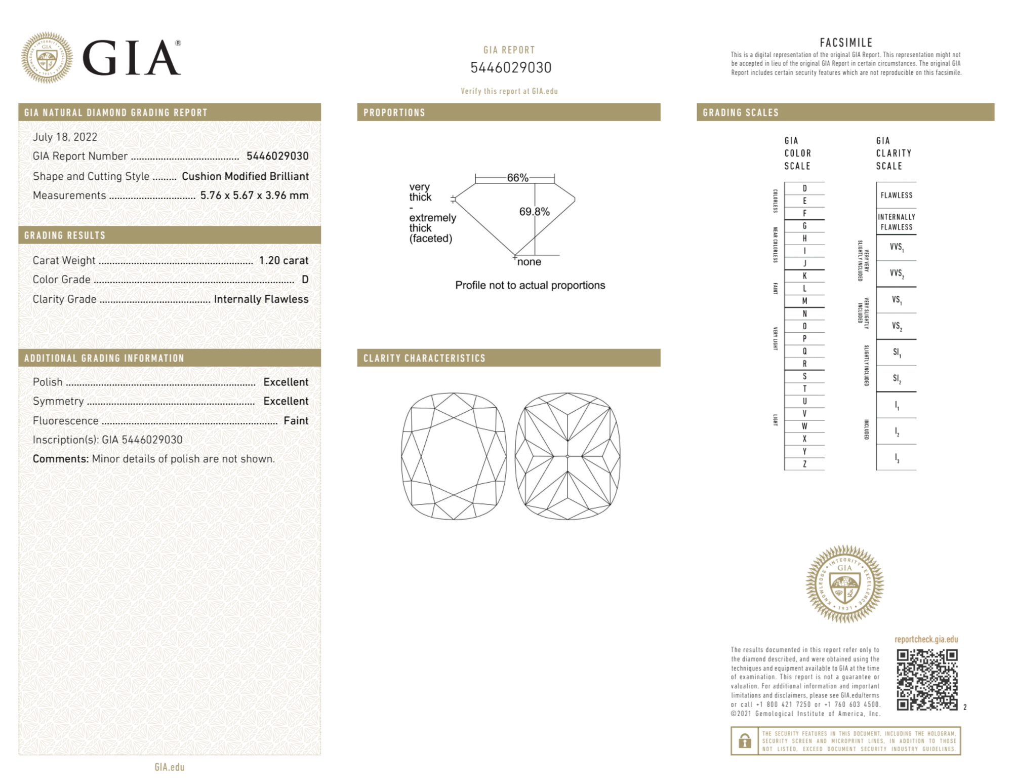 Your 1.20 carat Cushion natural diamond is graded IF clarity, which stands for Internally Flawless. Read more about IF clarity diamonds here, or learn more about diamond clarity in general here.