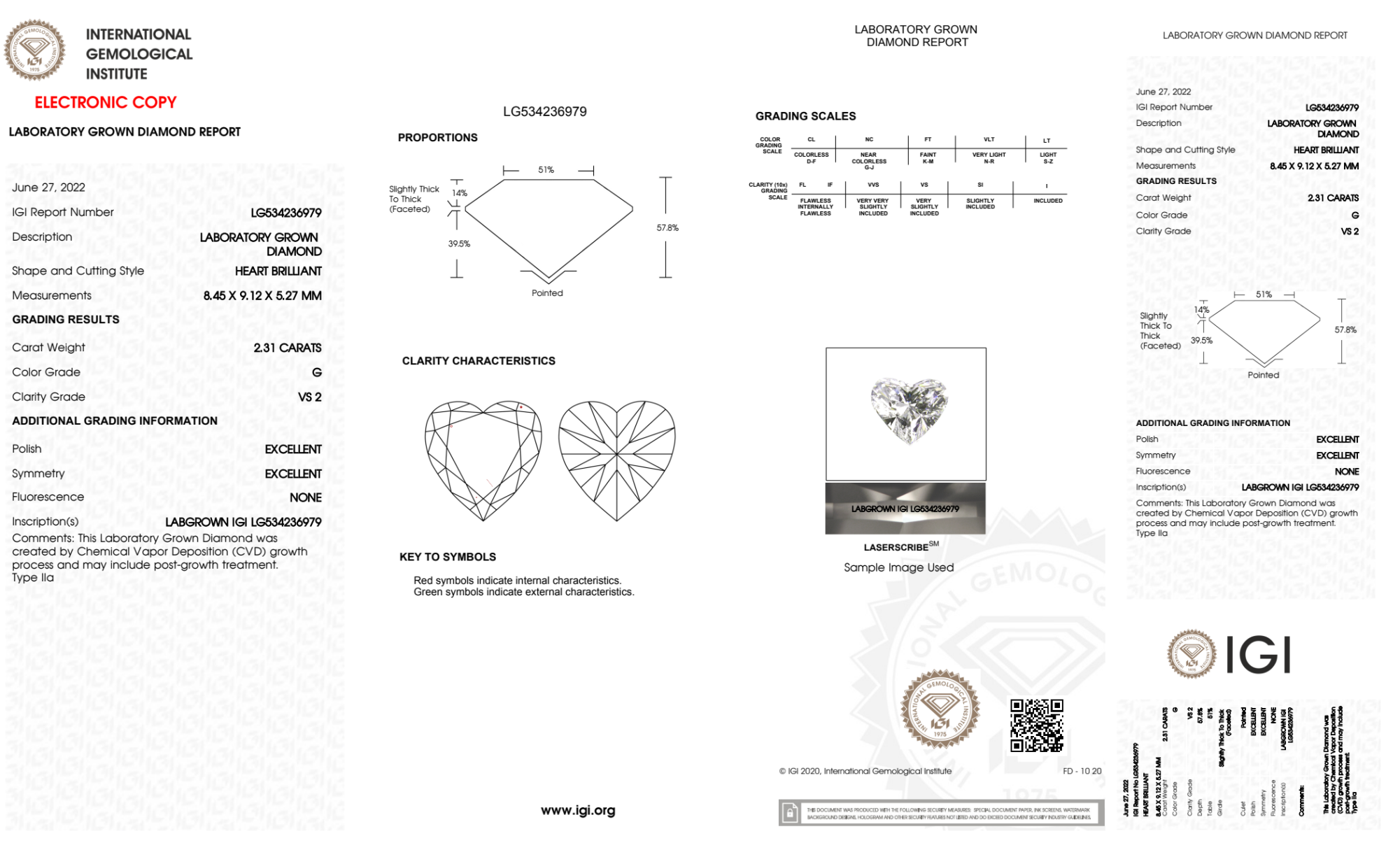 Your 2.31 carat Heart lab diamond is graded G color (Near Colorless), and you can read more about G color diamonds here.