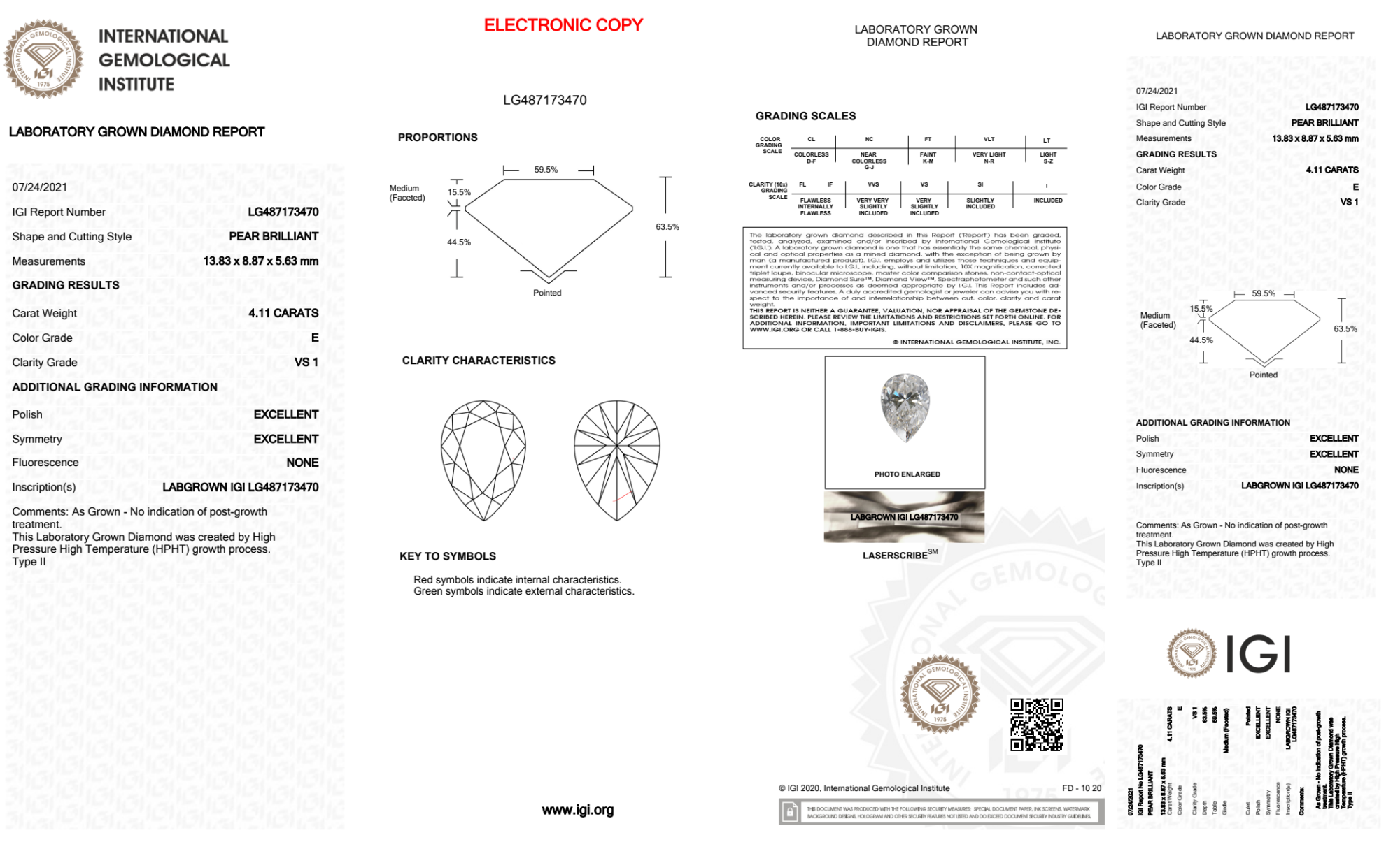 Your 4.11 carat Pear lab diamond is graded E color (Colorless), and you can read more about E color diamonds here.