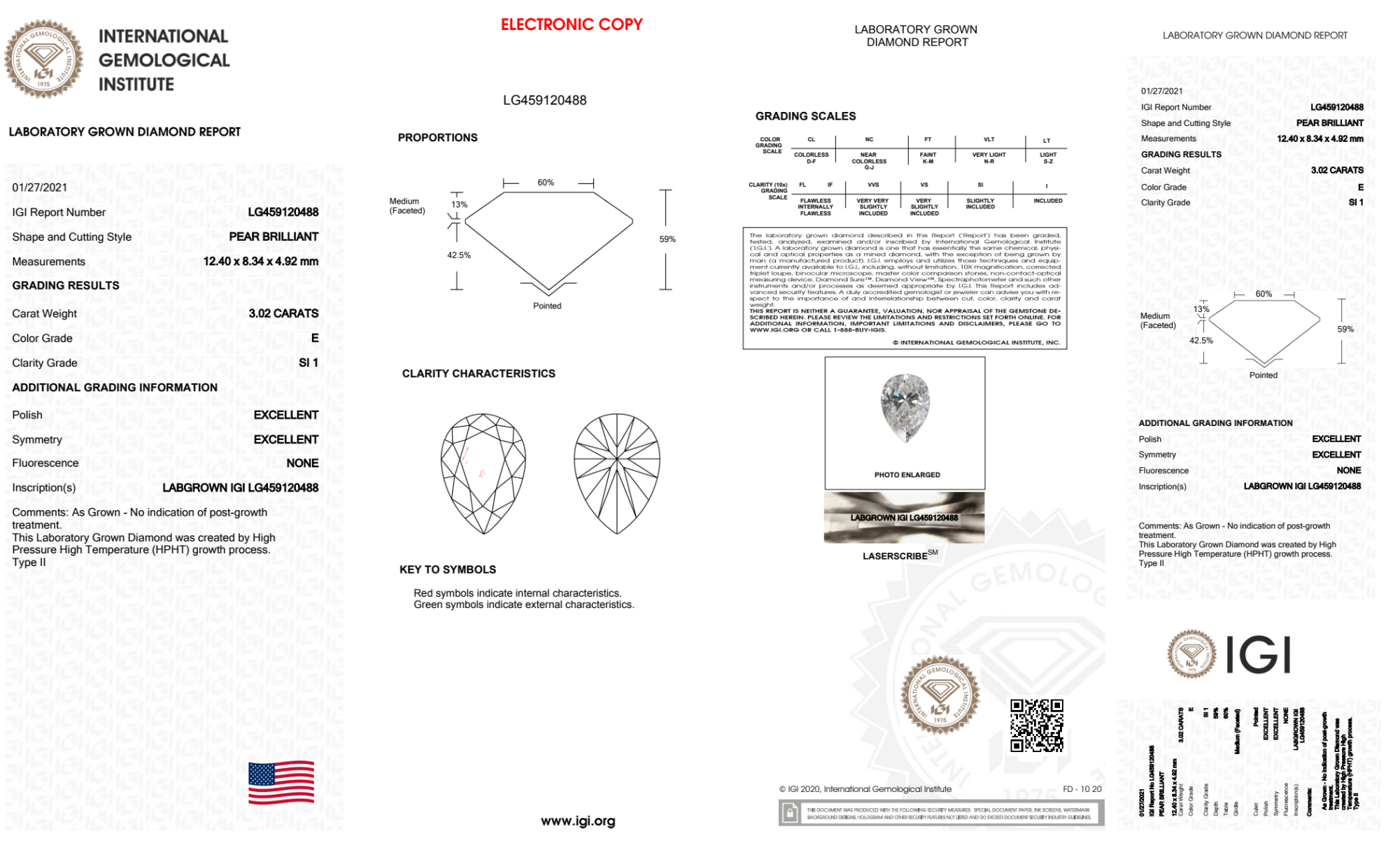 Your 3.02 carat Pear lab diamond is graded E color (Colorless), and you can read more about E color diamonds here.