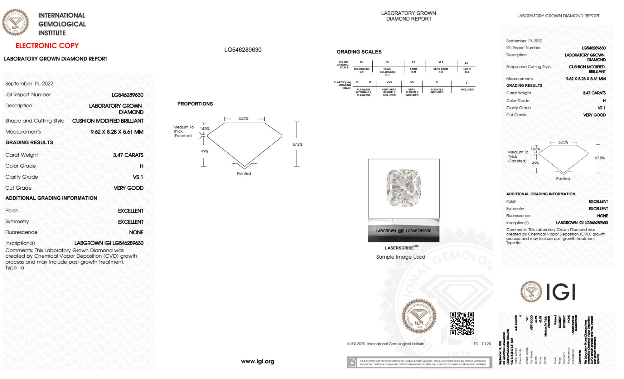 Your 3.47 carat Cushion lab diamond is graded H color (Near Colorless), and you can read more about H color diamonds here.