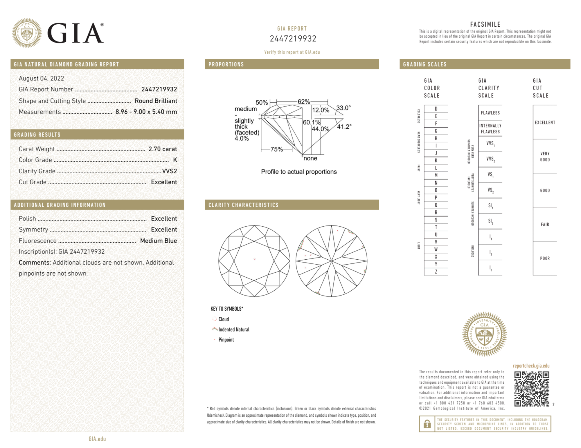 Your 2.70 carat Round natural diamond is graded VVS2 clarity, which stands for Very Very Slightly Included 2. Read more about VVS2 clarity diamonds here, or learn more about diamond clarity in general here.