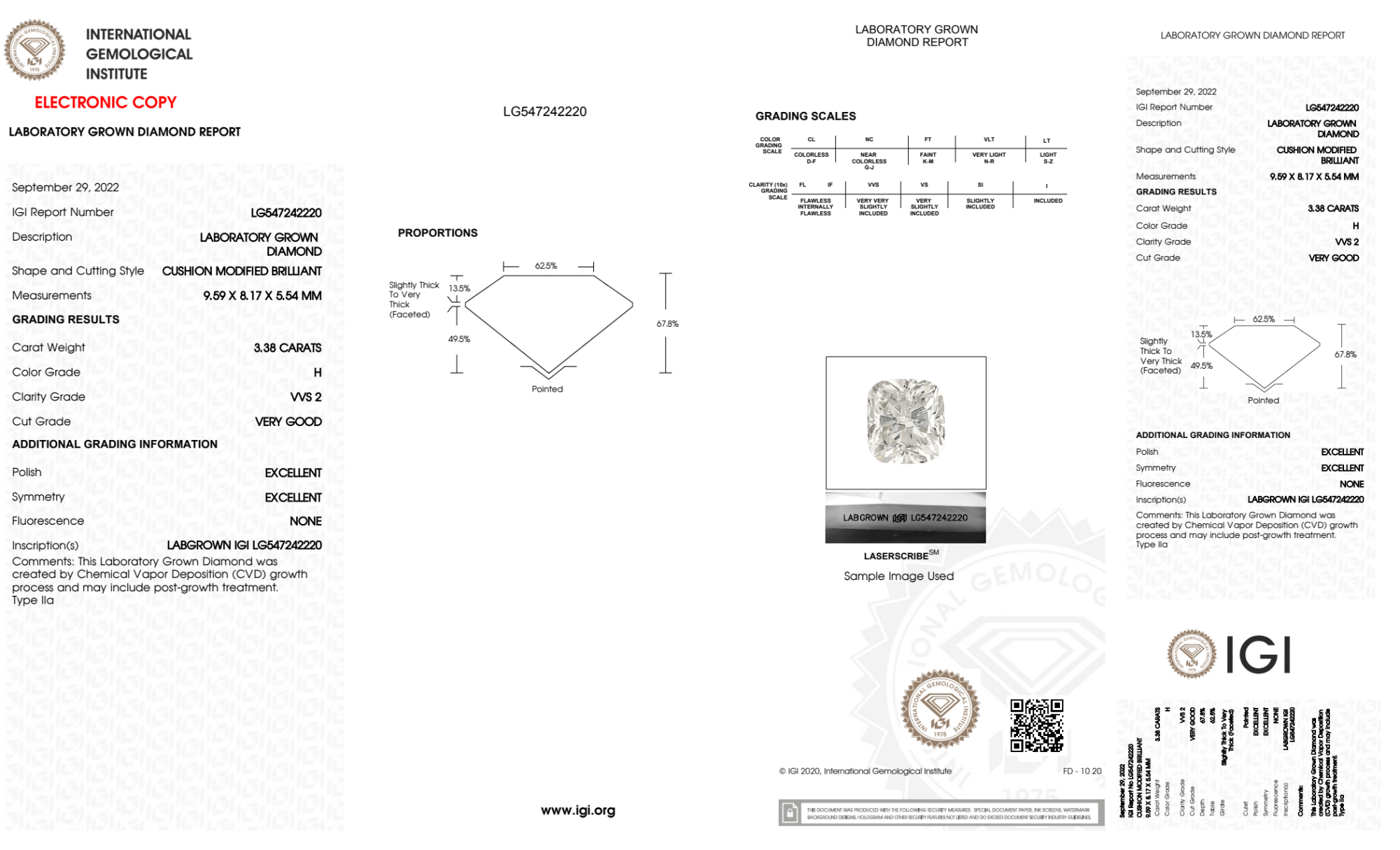 Your 3.38 carat Cushion lab diamond is graded H color (Near Colorless), and you can read more about H color diamonds here.