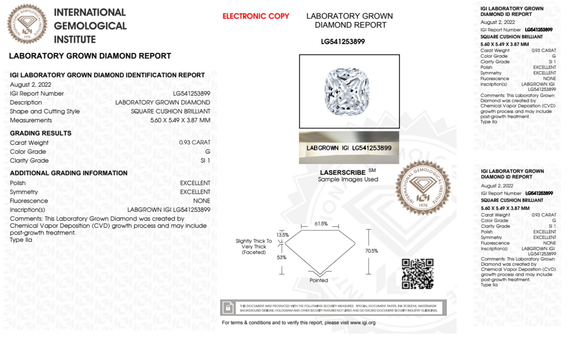 Your 0.93 carat Cushion lab diamond is graded G color (Near Colorless), and you can read more about G color diamonds here.