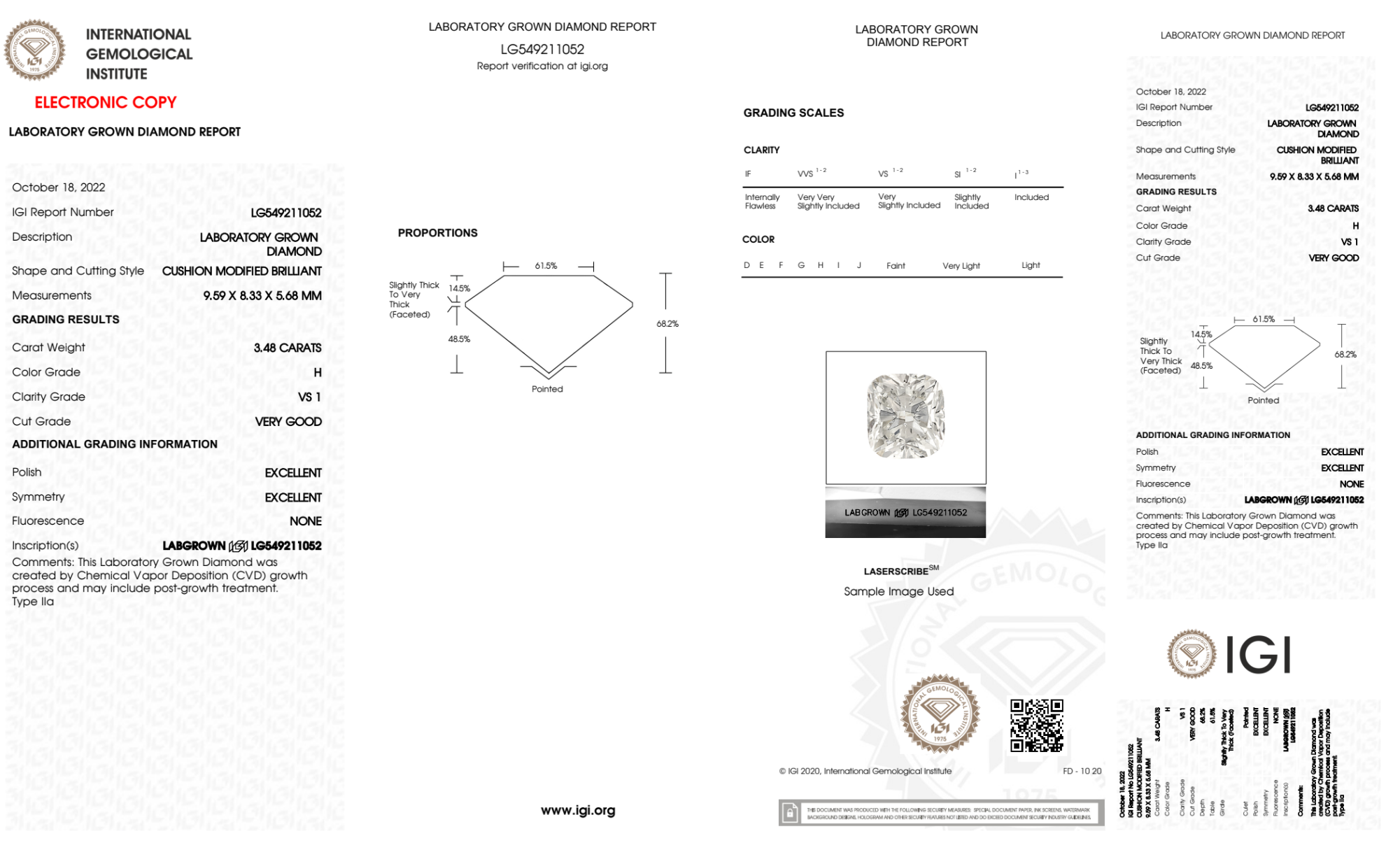Your 3.48 carat Cushion lab diamond is graded H color (Near Colorless), and you can read more about H color diamonds here.