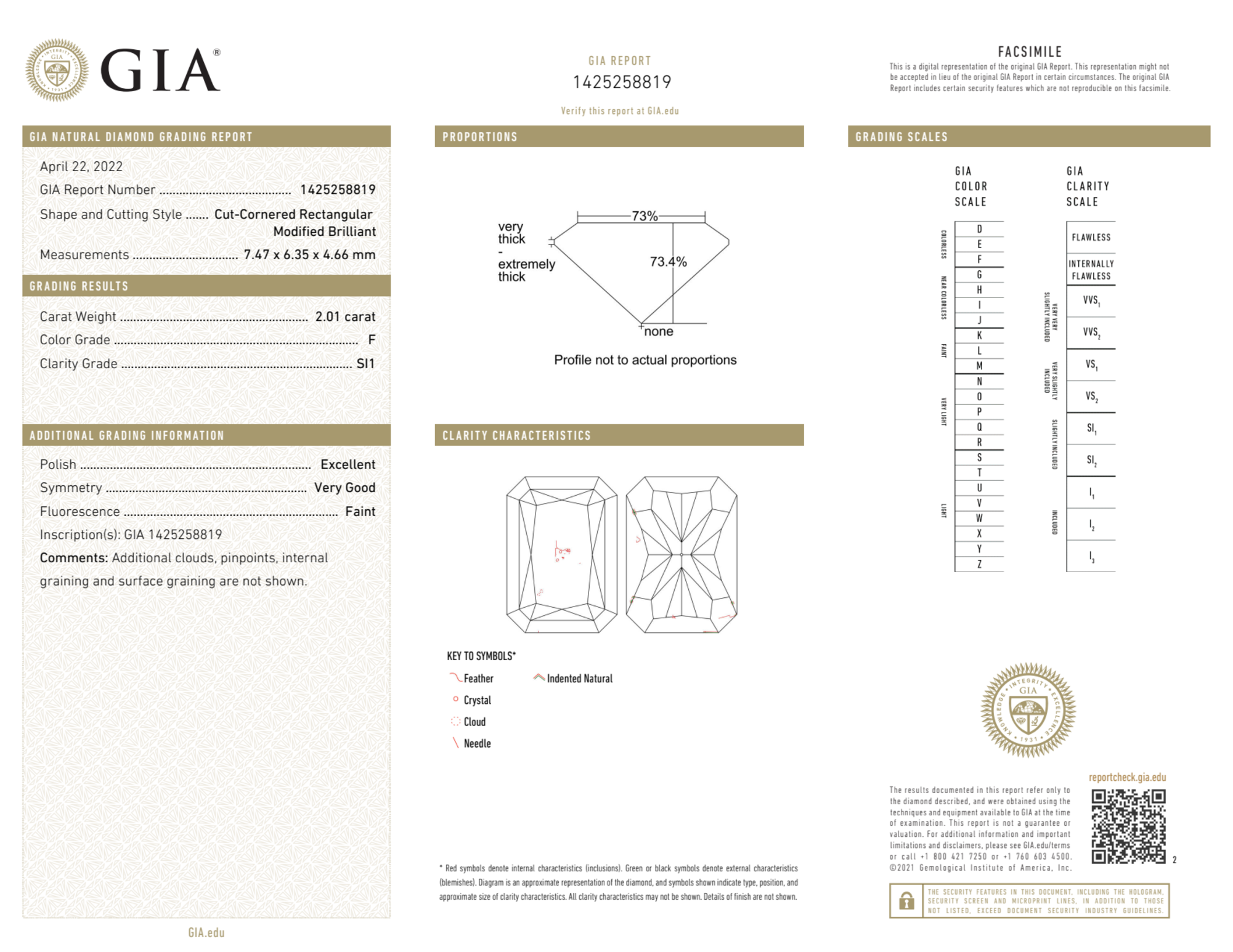 Your 2.01 carat Radiant natural diamond is graded SI1 clarity, which stands for Slightly Included 1. Read more about SI1 clarity diamonds here, or learn more about diamond clarity in general here.