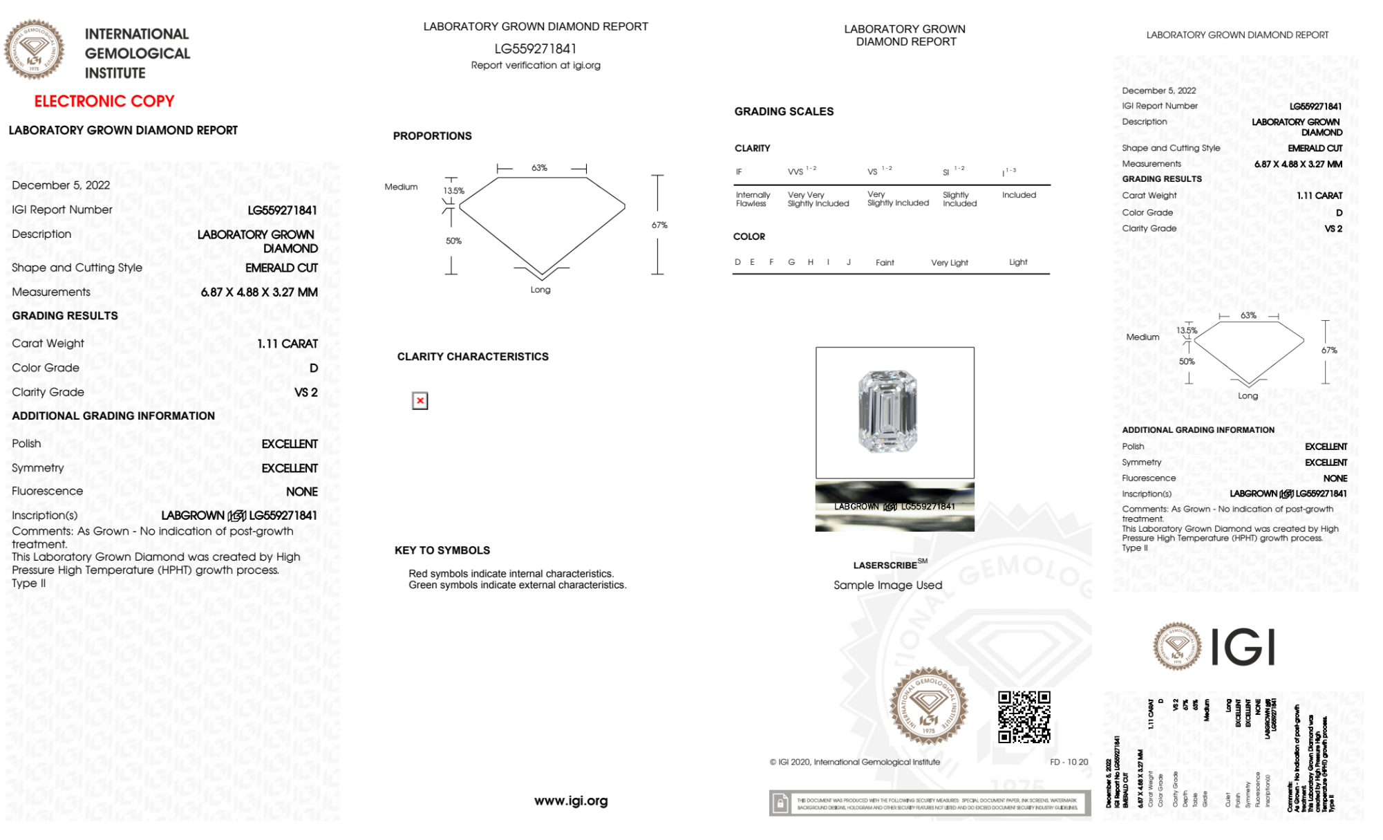 Your 1.11 carat Emerald lab diamond is graded VS2 clarity, which stands for Very Slightly Included 2. Read more about VS2 clarity diamonds here, or learn more about diamond clarity in general here.