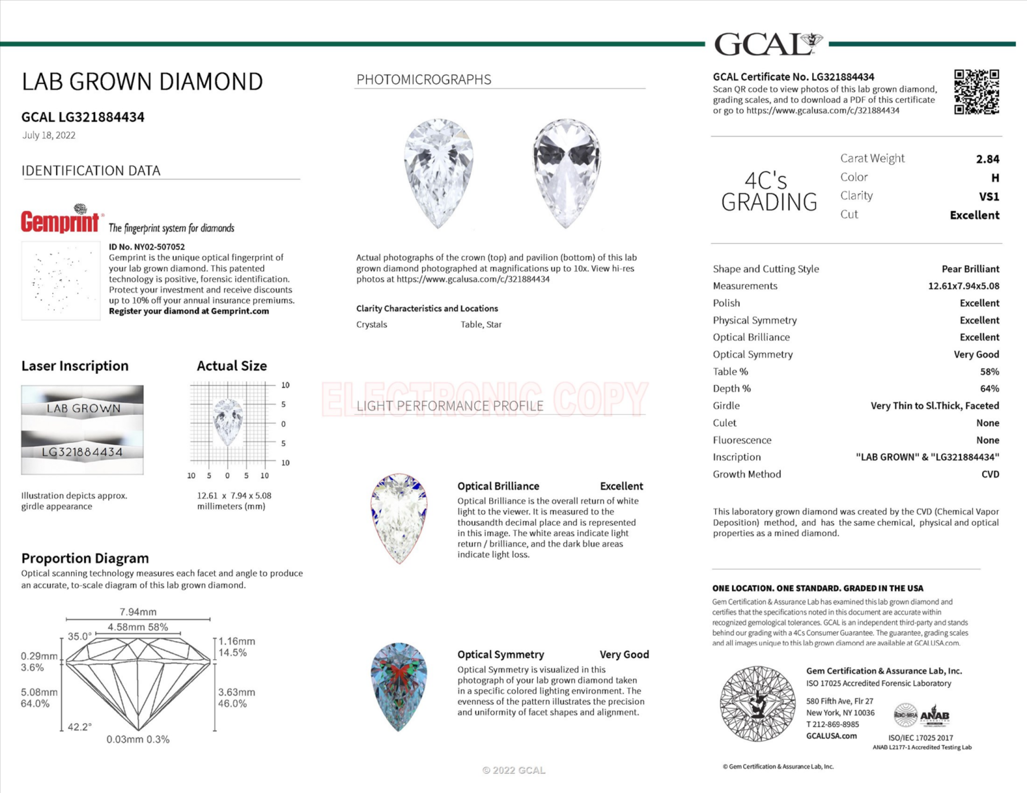 Your 2.84 carat Pear lab diamond is graded H color (Near Colorless), and you can read more about H color diamonds here.
