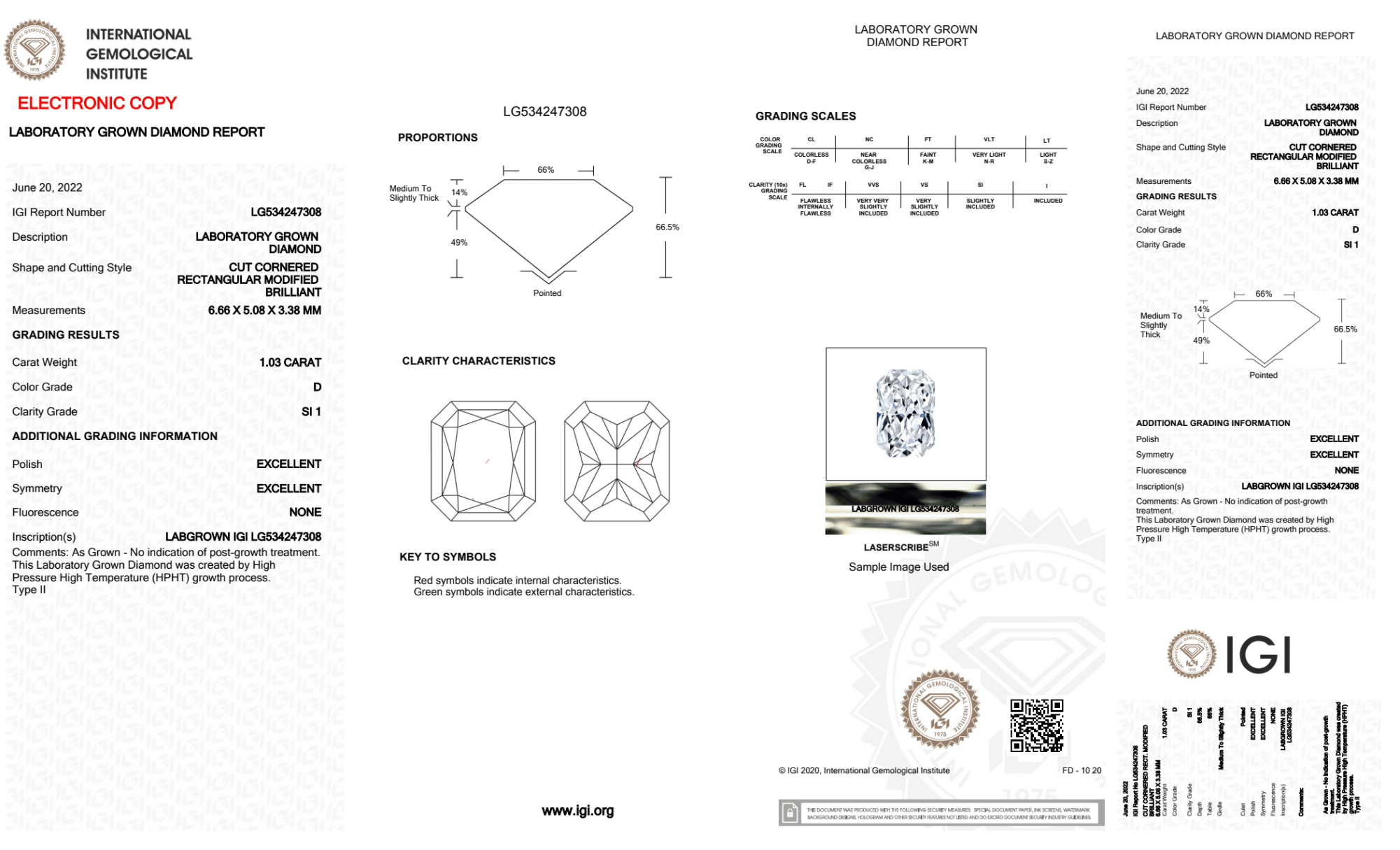 Your 1.03 carat Radiant lab diamond is graded D color (Colorless), and you can read more about D color diamonds here.