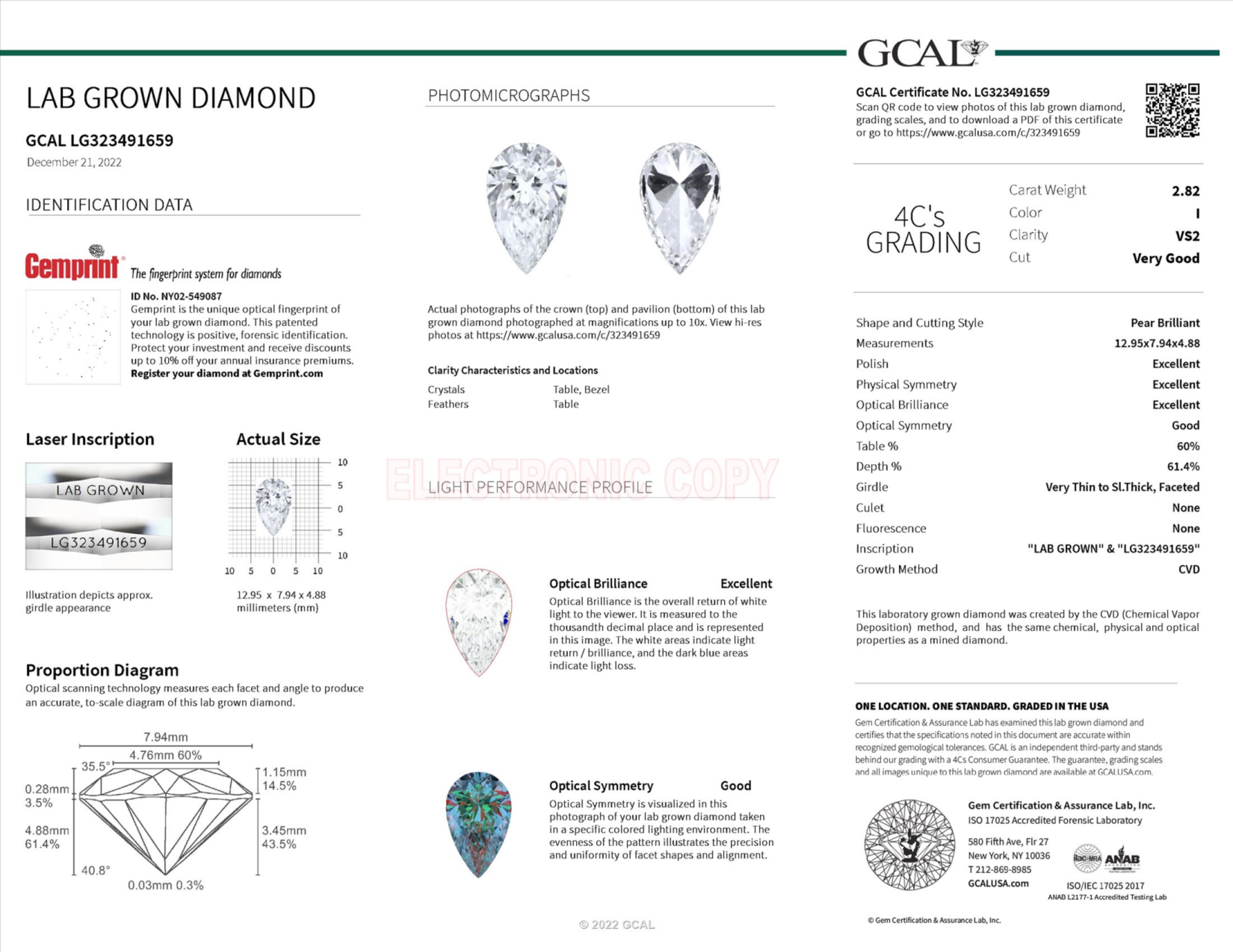 Your 2.82 carat Pear lab diamond is graded VS2 clarity, which stands for Very Slightly Included 2. Read more about VS2 clarity diamonds here, or learn more about diamond clarity in general here.