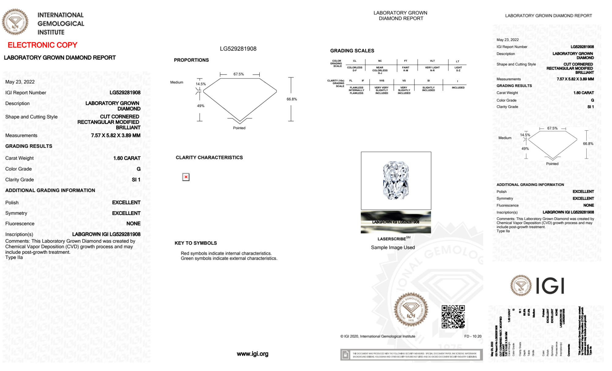 Your 1.60 carat Radiant lab diamond is graded G color (Near Colorless), and you can read more about G color diamonds here.