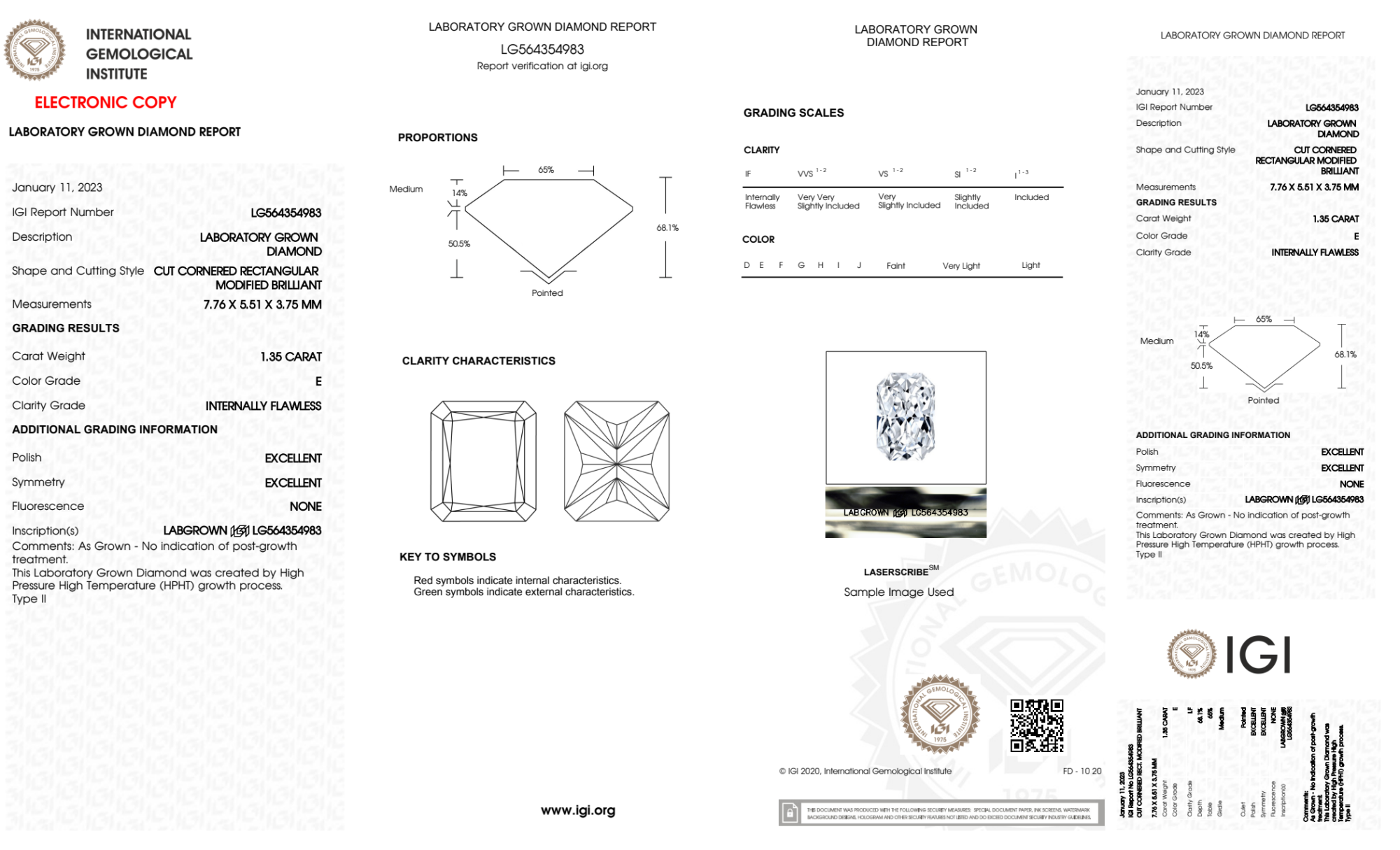 Your 1.35 carat Radiant lab diamond is graded E color (Colorless), and you can read more about E color diamonds here.