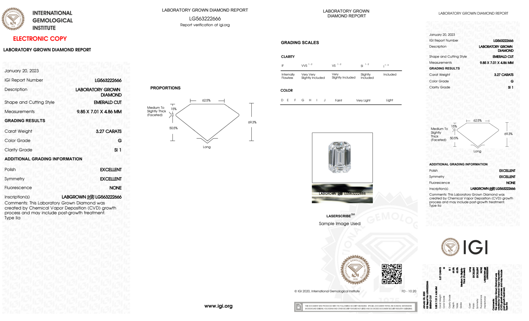 Your 3.27 carat Emerald lab diamond is graded G color (Near Colorless), and you can read more about G color diamonds here.
