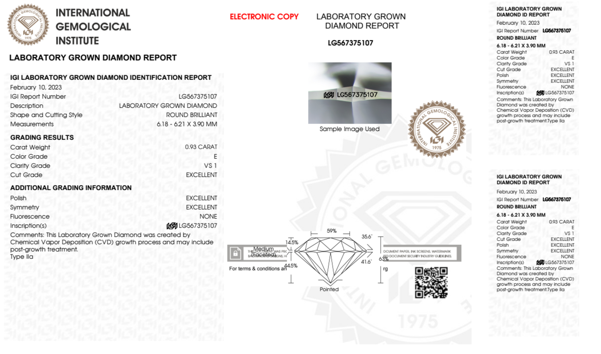 Your 0.93 carat Round lab diamond is graded E color (Colorless), and you can read more about E color diamonds here.