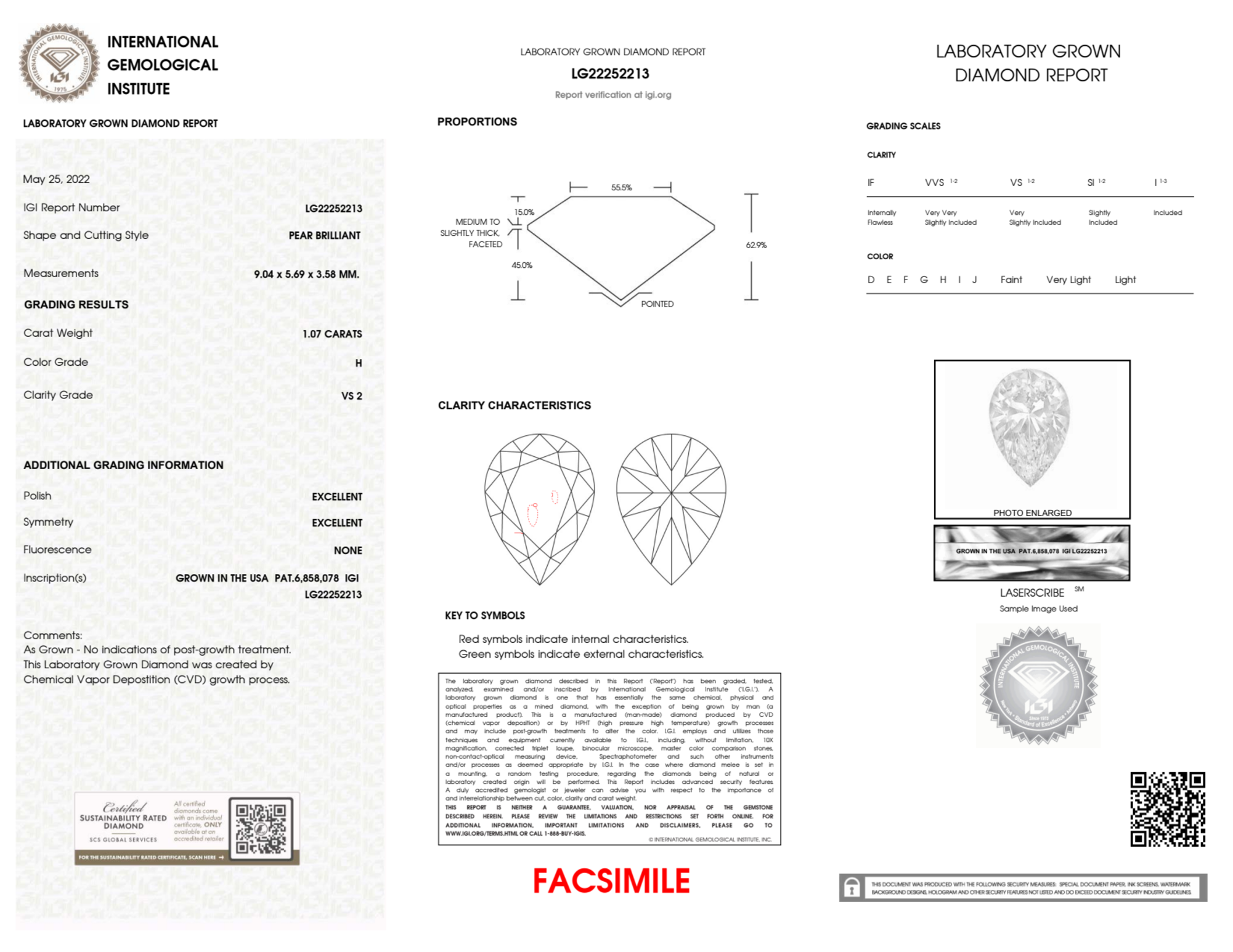 Your 1.07 carat Pear lab diamond is graded VS2 clarity, which stands for Very Slightly Included 2. Read more about VS2 clarity diamonds here, or learn more about diamond clarity in general here.