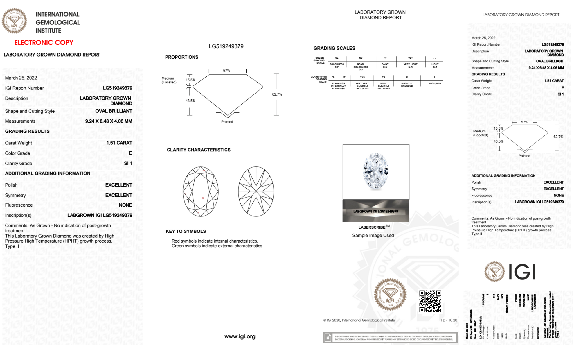 Your 1.51 carat Oval lab diamond is graded E color (Colorless), and you can read more about E color diamonds here.