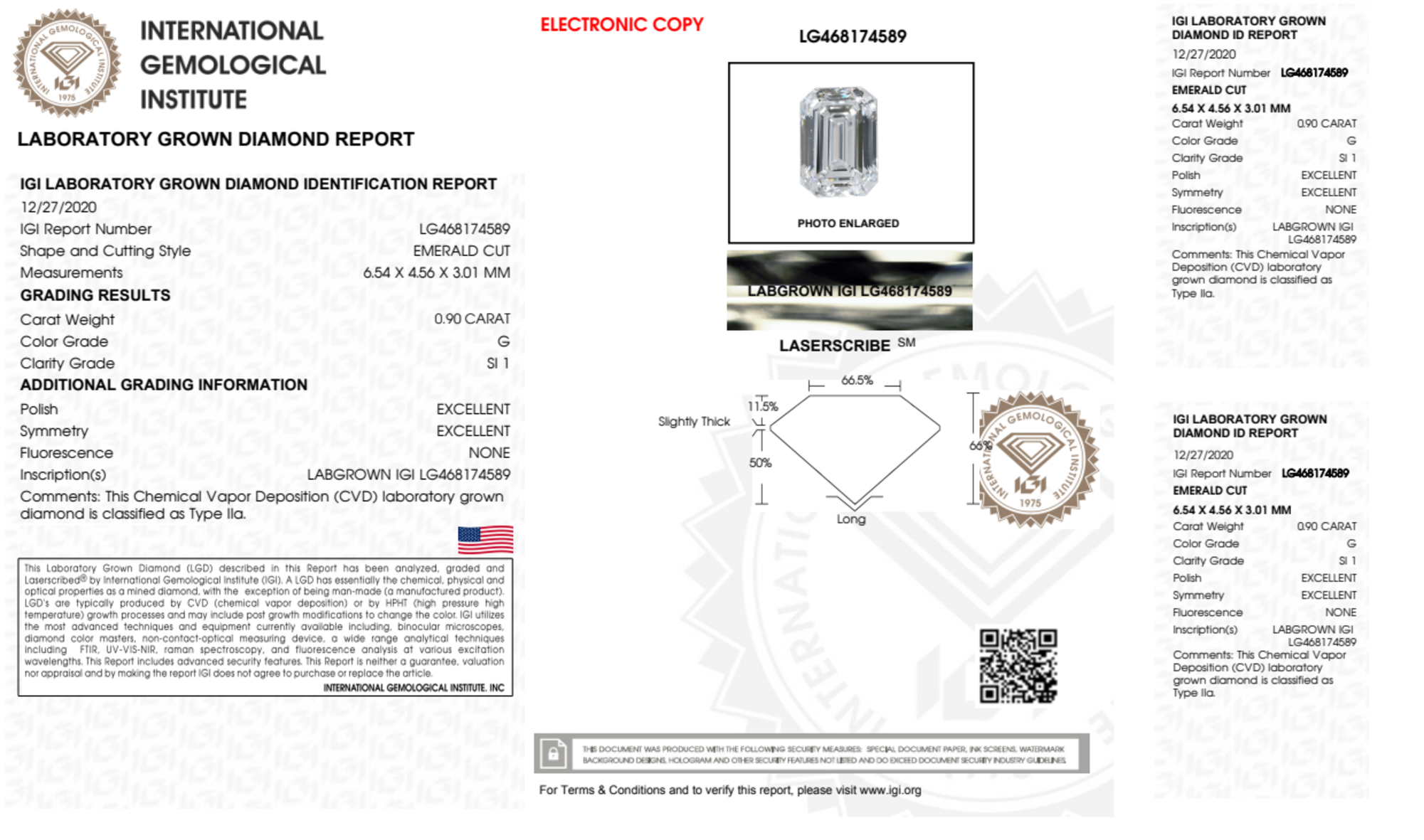Your 0.90 carat Emerald lab diamond is graded G color (Near Colorless), and you can read more about G color diamonds here.