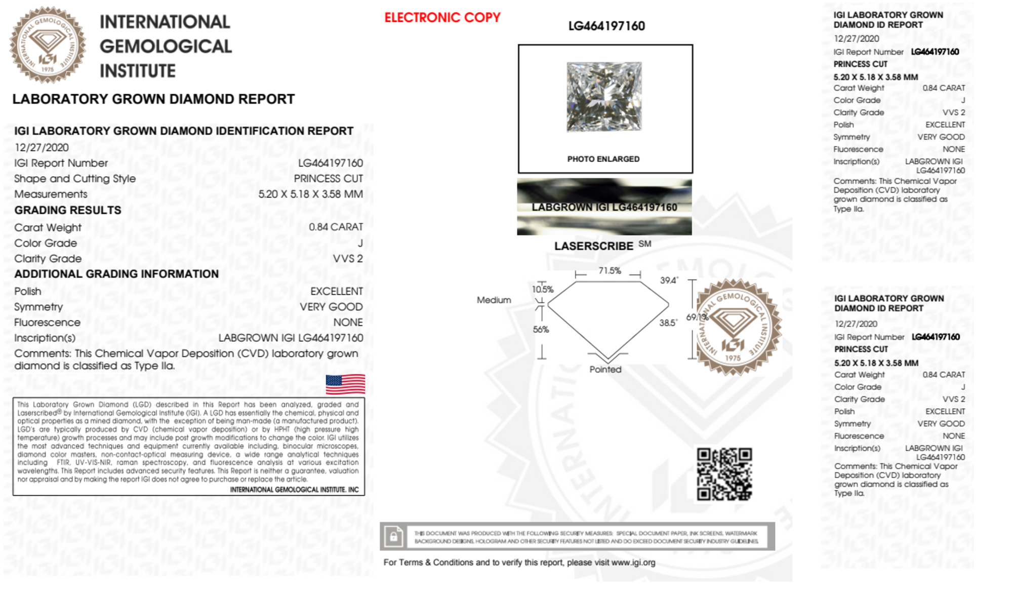 Your 0.84 carat Princess lab diamond is graded J color (Near Colorless), and you can read more about J color diamonds here.