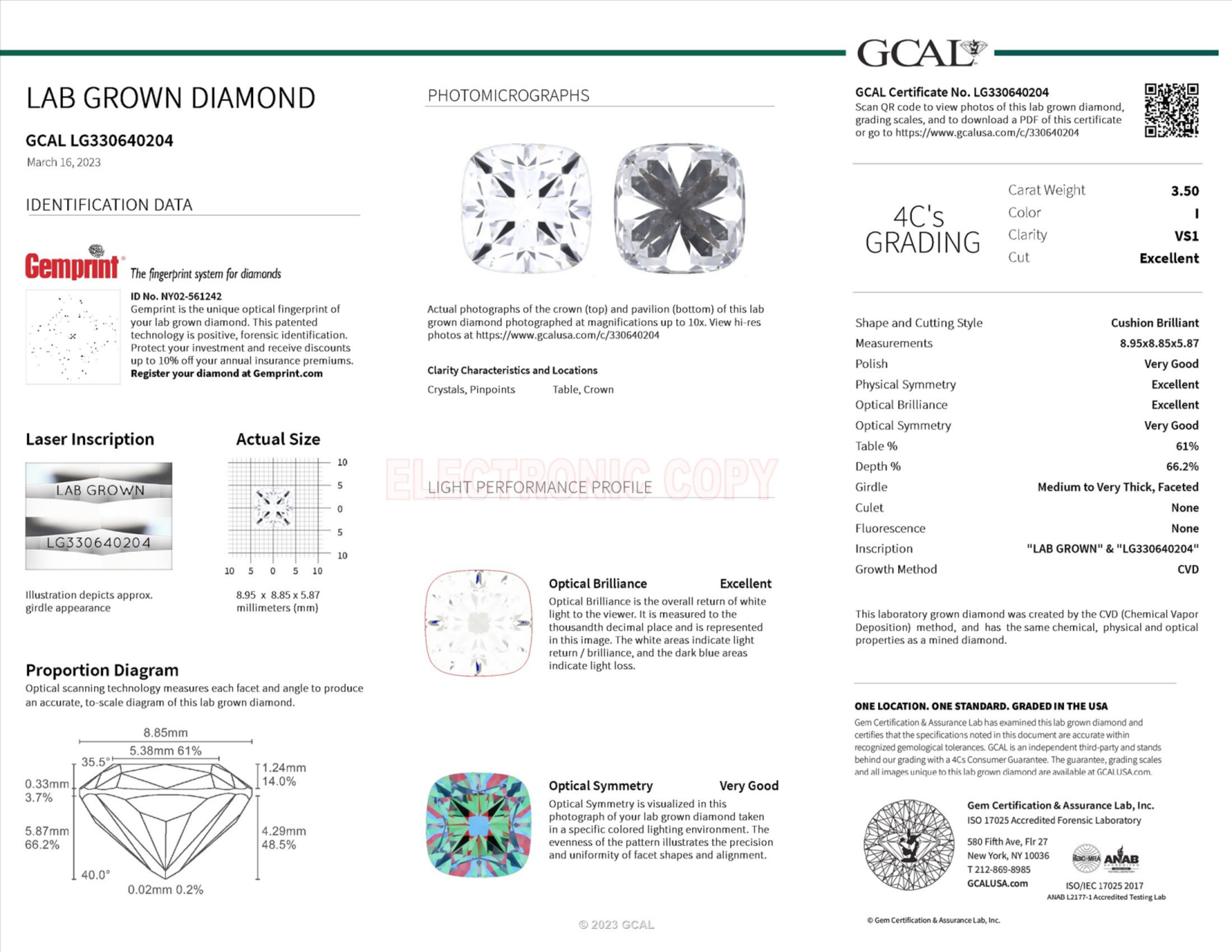 Your 3.50 carat Cushion lab diamond is graded VS1 clarity, which stands for Very Slightly Included 1. Read more about VS1 clarity diamonds here, or learn more about diamond clarity in general here.