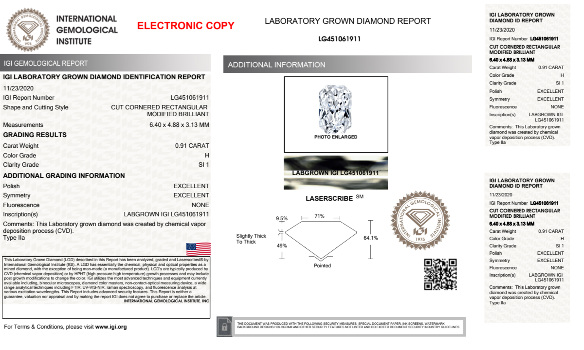Your 0.91 carat Radiant lab diamond is graded H color (Near Colorless), and you can read more about H color diamonds here.