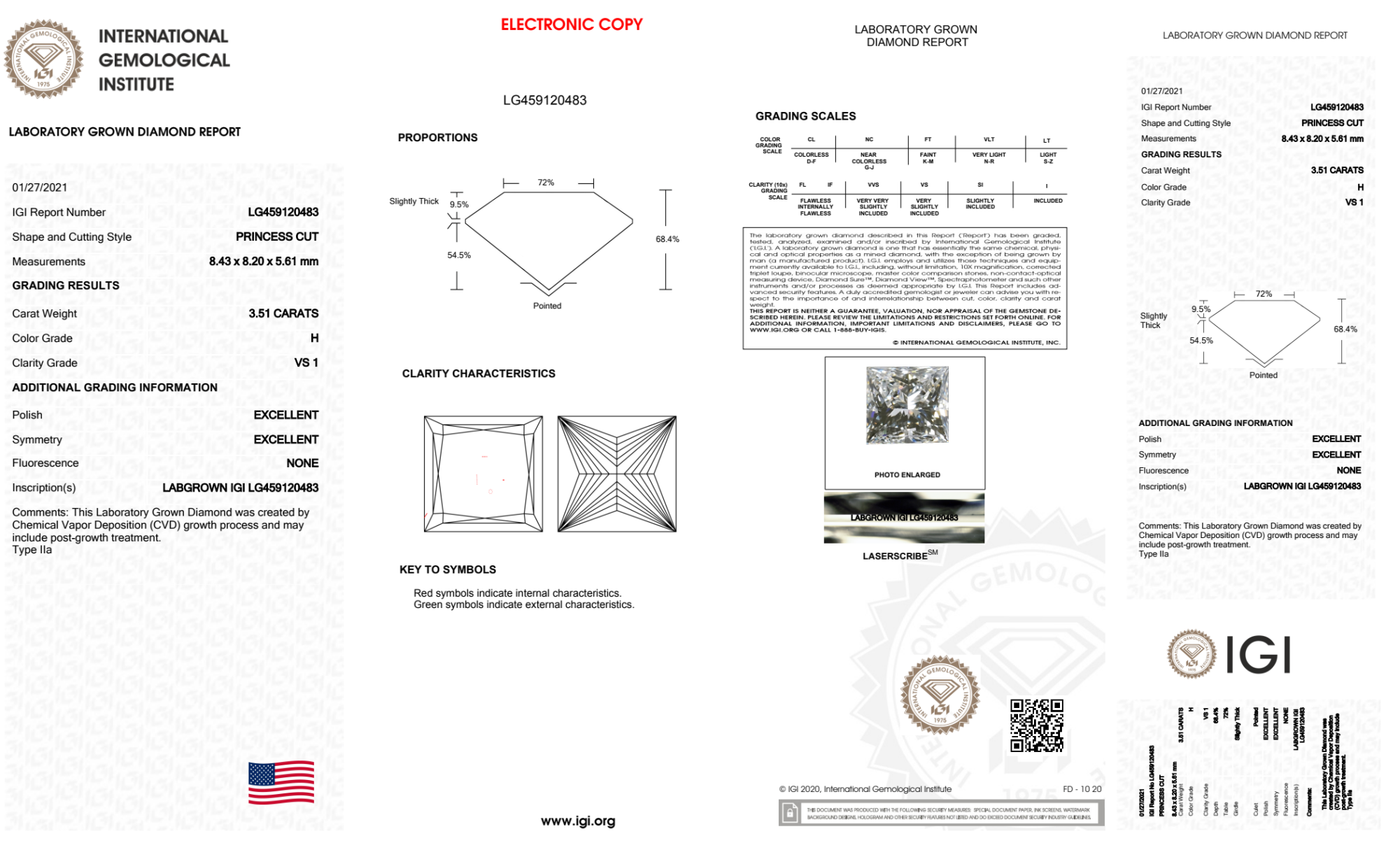 Your 3.51 carat Princess lab diamond is graded H color (Near Colorless), and you can read more about H color diamonds here.
